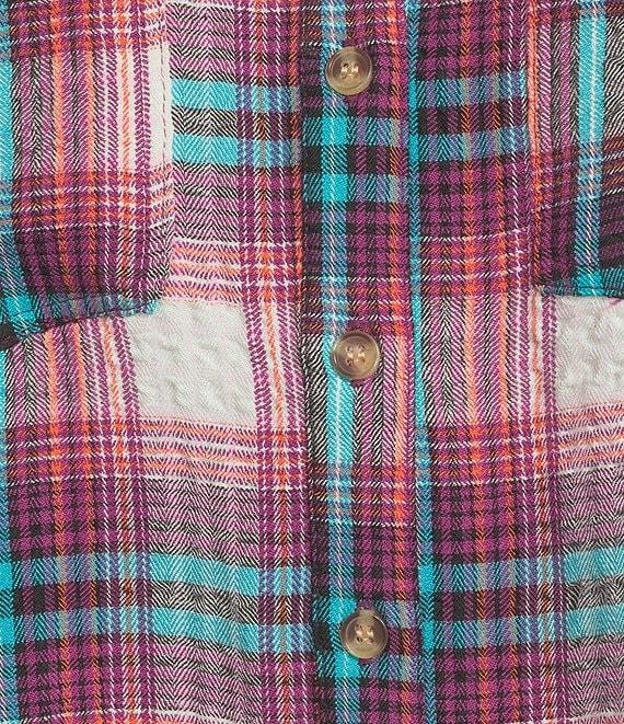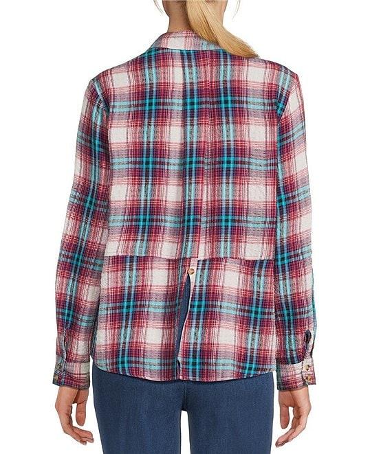 From Intro, this shirt features: Woven pucker plaid fabrication Point collar 3/4 rolled-tab sleeves Two functional patch pockets Split back with button detail Button-front closure Approx. 26.75" length Rayon/polyester/elastane Machine wash/ line dry Imported.