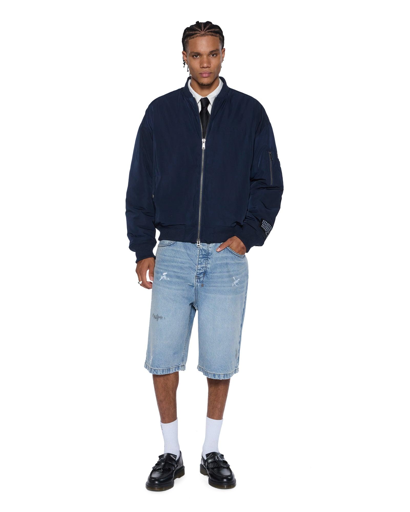 The Intruder Bomber Jacket Navy is an oversized padded bomber made from premium navy nylon. It features a classic sleeve pocket with branded metal plate, welt snap pockets, internal lining pocket, and zip-through closure, finished with debossed Sign of the Times logos and tonal T-box and 4x4 embroidery.