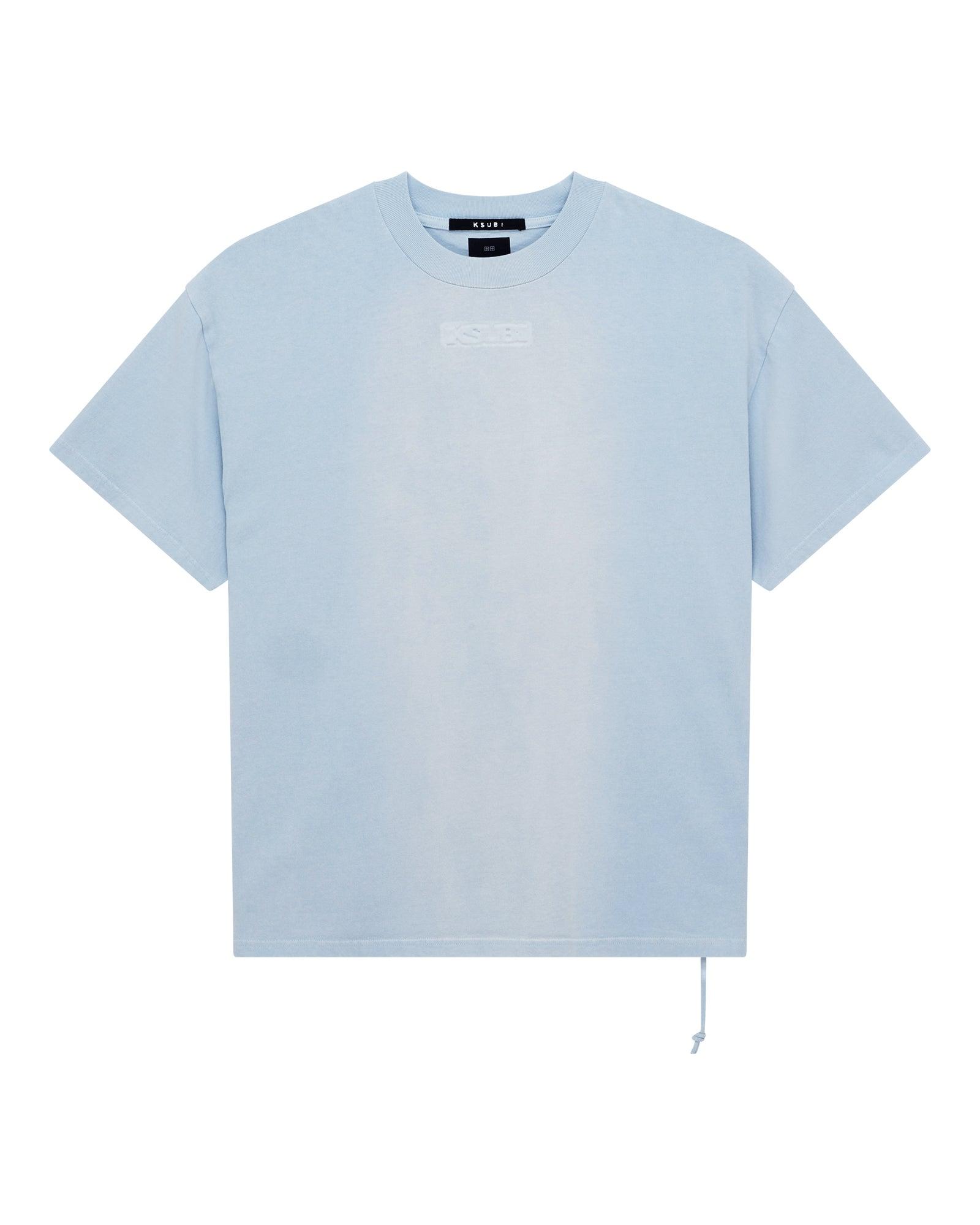 The Intruder Ekcess Ss Tee Ice Mist is a boxy oversized short sleeve t-shirt with a dropped shoulder and raw cut back hem. Made from premium heavy weight cotton jersey garment dyed in Blue Mist, it features a reversed overlocked side seam, signature rats tail, debossed "Sign of the Times" artwork on the front crest and back, and T-box and 4x4 embroidery branding.