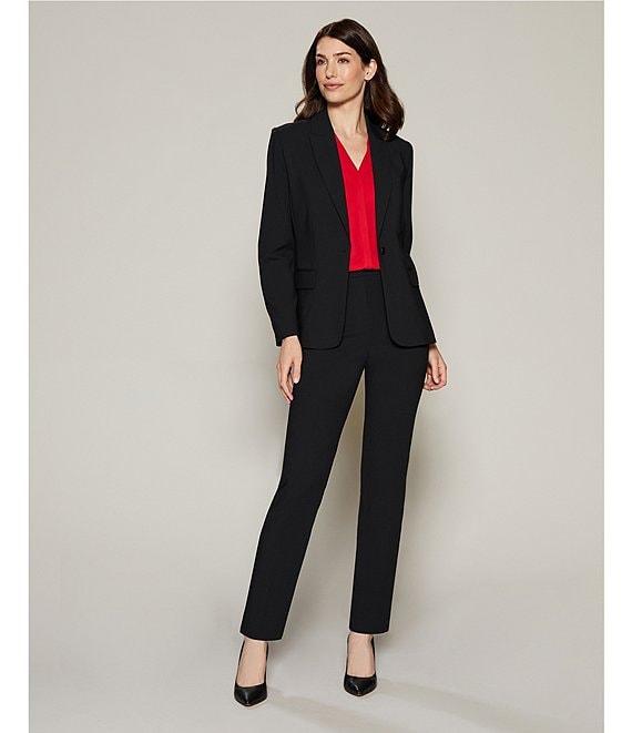 From Investments, these pants feature: Slim leg silhouette belt loops Functional back pockets Bi-stretch, breathable fabric Natural wrinkle resistant Front hook/zip closure Approx. 27" short; 29" regular inseam polyester/rayon/spandex Machine wash/dry flat Imported.