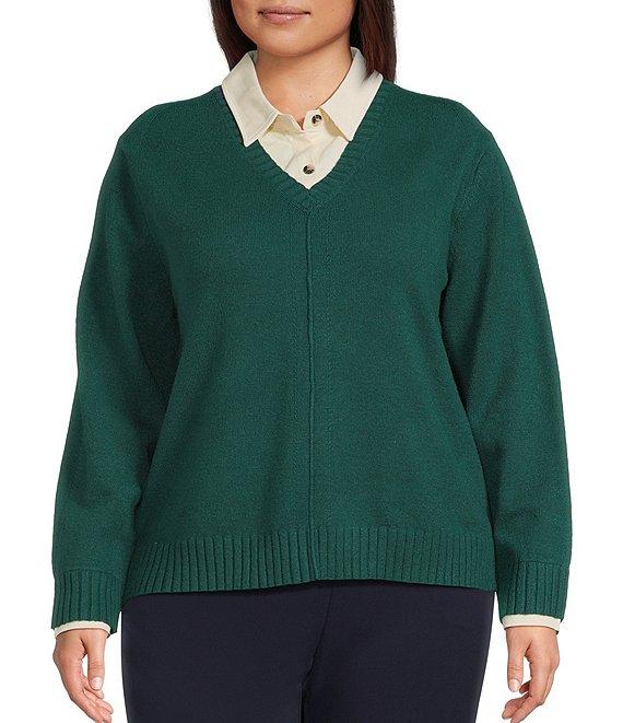 From Investments Plus, this sweater features: Twofer silhouette Point collar with button detail Long sleeves with cuff detail Pullover construction Shell: rayon/polyester/nylon; neck and cuff: rayon/nylon/spandex Machine wash/dry flat Imported.