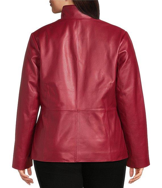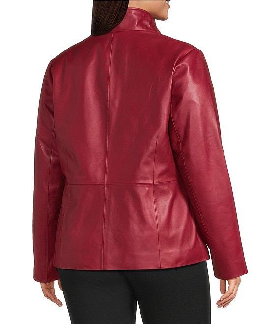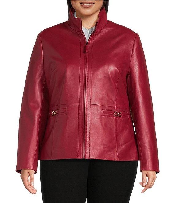 From Investments Plus Size, this jacket features: Stand collar Long sleeves Hardware detail at pockets Center front zip closure Approx. 26" center back length Genuine lamb leather Leather method dry cleaning Imported.