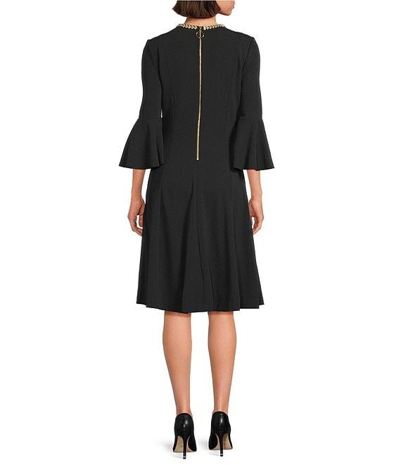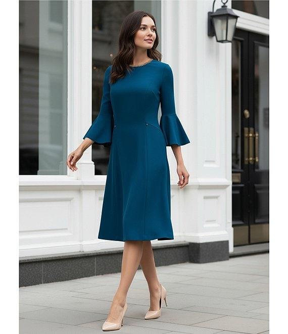 From Investments Dresses, this dress features: Scuba crepe fabrication 3/4 bell sleeves Crew neckline with jewelry embellishment Fit and flare silhouette Partial back zip Flattering seams Hidden zip pockets Lined Approx. 43" length Polyester/spandex Machine wash / tumble dry Imported.