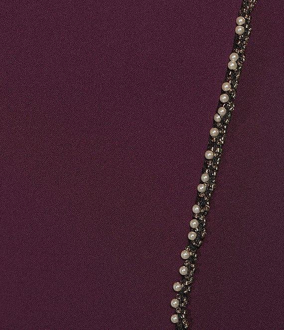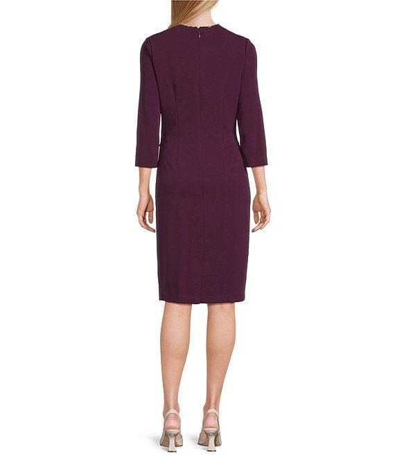 From Investments Dresses, this dress features: Scuba crepe fabrication 3/4 sleeves Crew neckline with jewelry embellishment Sheath silhouette Skirt embellishment Partial back zip Hook and eye Lined Approx. 42.75" length Polyester/spandex Machine wash / tumble dry Imported.