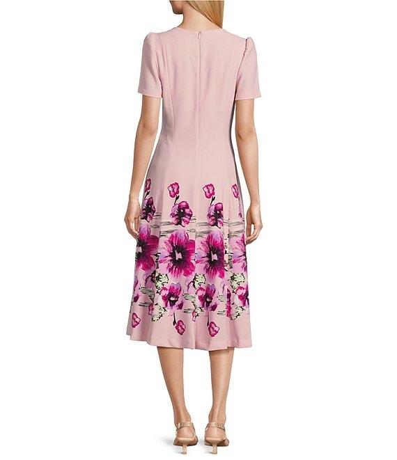 From Investments Dresses, this dress features: Scuba crepe fabrication Short sleeves V-neckline Fit and flare silhouette Partial back zip Flattering seams Lined Hidden zip pockets Approx. 43" length Polyester/spandex Machine wash/tumble dry Imported.