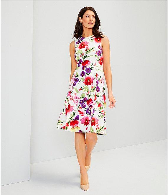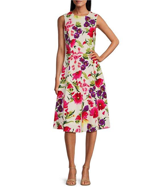 Investments Scuba Crepe Multi Floral Sleeveless Fit and Flare Midi Dress