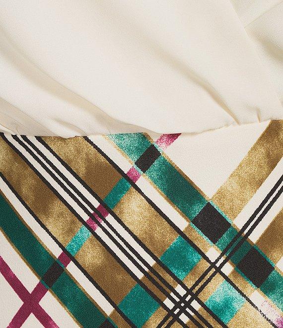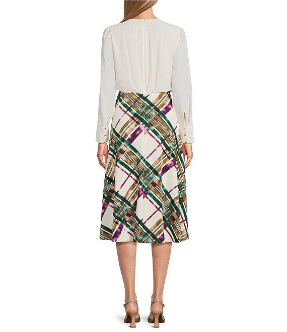 From Investments Dresses, this dress features: Scuba crepe fabrication Long sleeves Hidden partial back zip, hook and eye V-neckline 3 button cuff detail Faux wrap detail Lined Approx. 47" length Polyester/spandex Machine wash / tumble dry Imported.