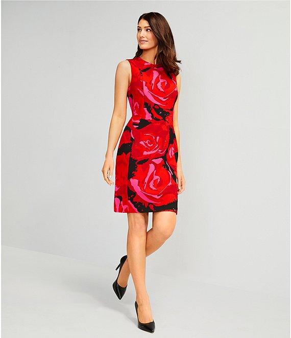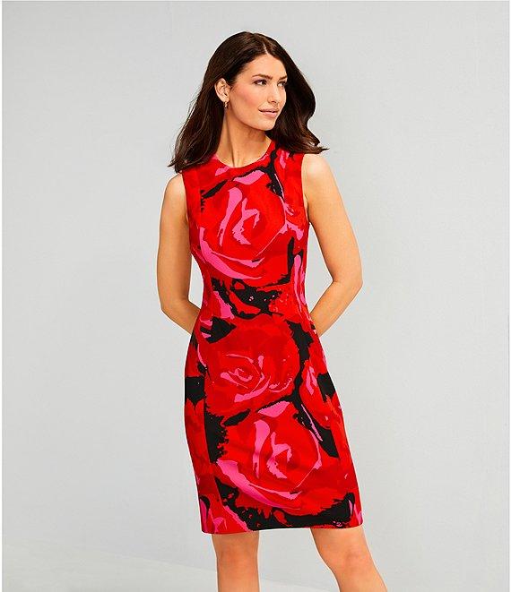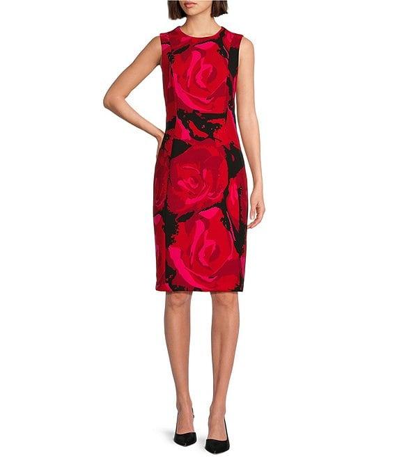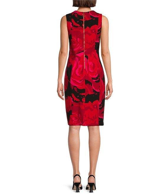 Investments Scuba Crepe red Roses Print Sleeveless Sheath Dress