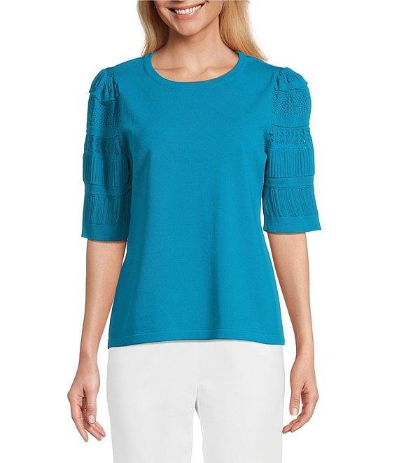 From Investments, this top features: Crew neckline Short sleeve with stitch detailing Pullover construction Viscose/nylon/polyester Machine wash/dry flat Imported.