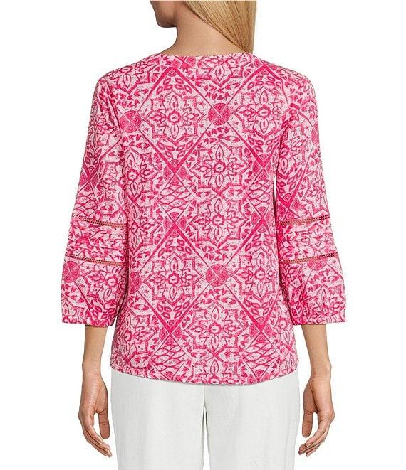 Investments Woven Etch Print 3/4 Sleeve Y-Neck Button Front Top