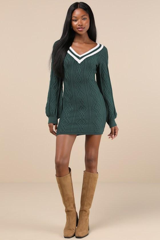 The delightful vibes of the Lulus Inviting Poise Green and White Cable Knit Sweater Mini Dress will have feeling absolutely darling all season long! This cozy sweater dress boasts a classic cable knit design throughout the flirty bodycon silhouette that features a V-neckline, long balloon sleeves with fitted cuffs, and a cute mini hem. Varsity-inspired white stripes accent the neckline to add a sense of collegiate charm, while contrasting ribbed knit at the cuffs and hems complete the look!