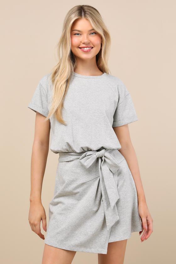 Comfortable doesn't have to mean casual, and this heathered jersey knit dress is the perfect example that comfy styling can definitely be cute. The relaxed-fit bodice features short sleeves and a crew neckline, all atop a faux-wrap skirt with a pleated overlapping panel, long sashes that tie at the side, and a flirty mini hem.