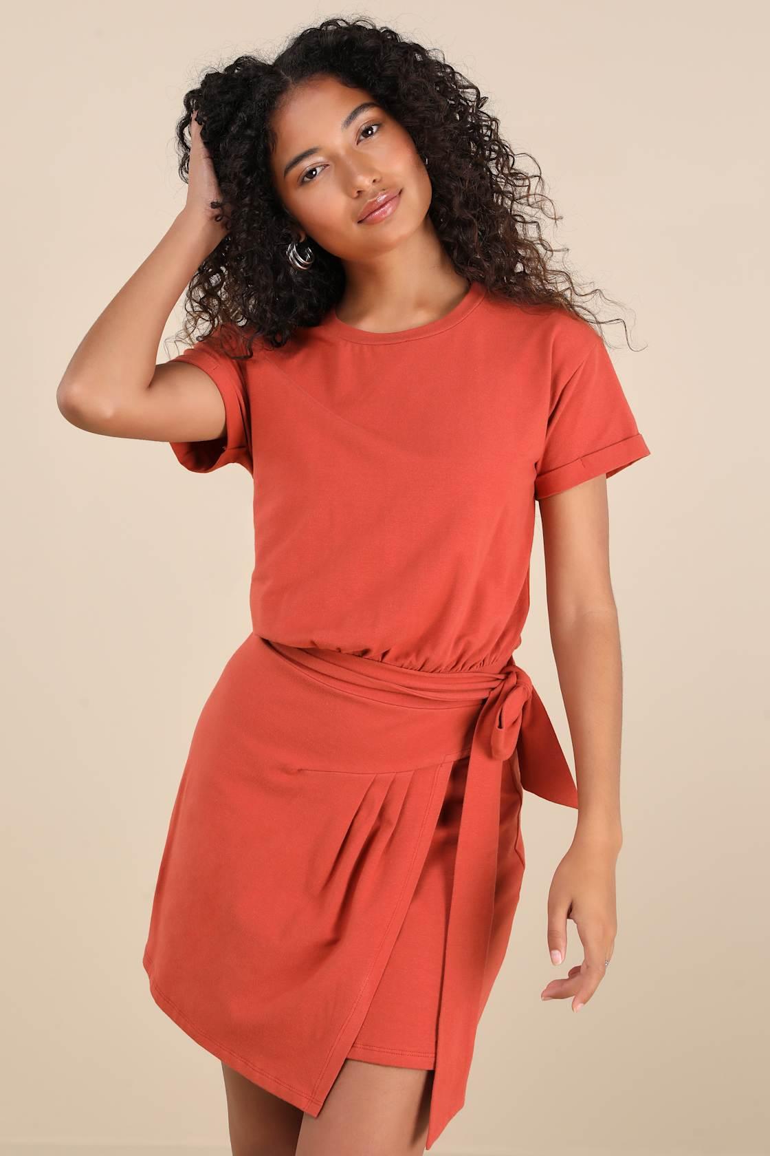 Comfortable doesn't have to mean casual, and this jersey knit dress is the perfect example that comfy styling can definitely be cute. The relaxed-fit bodice features short sleeves and a crew neckline, all atop a faux-wrap skirt with a pleated overlapping panel, long sashes that tie at the side, and flirty mini hem.