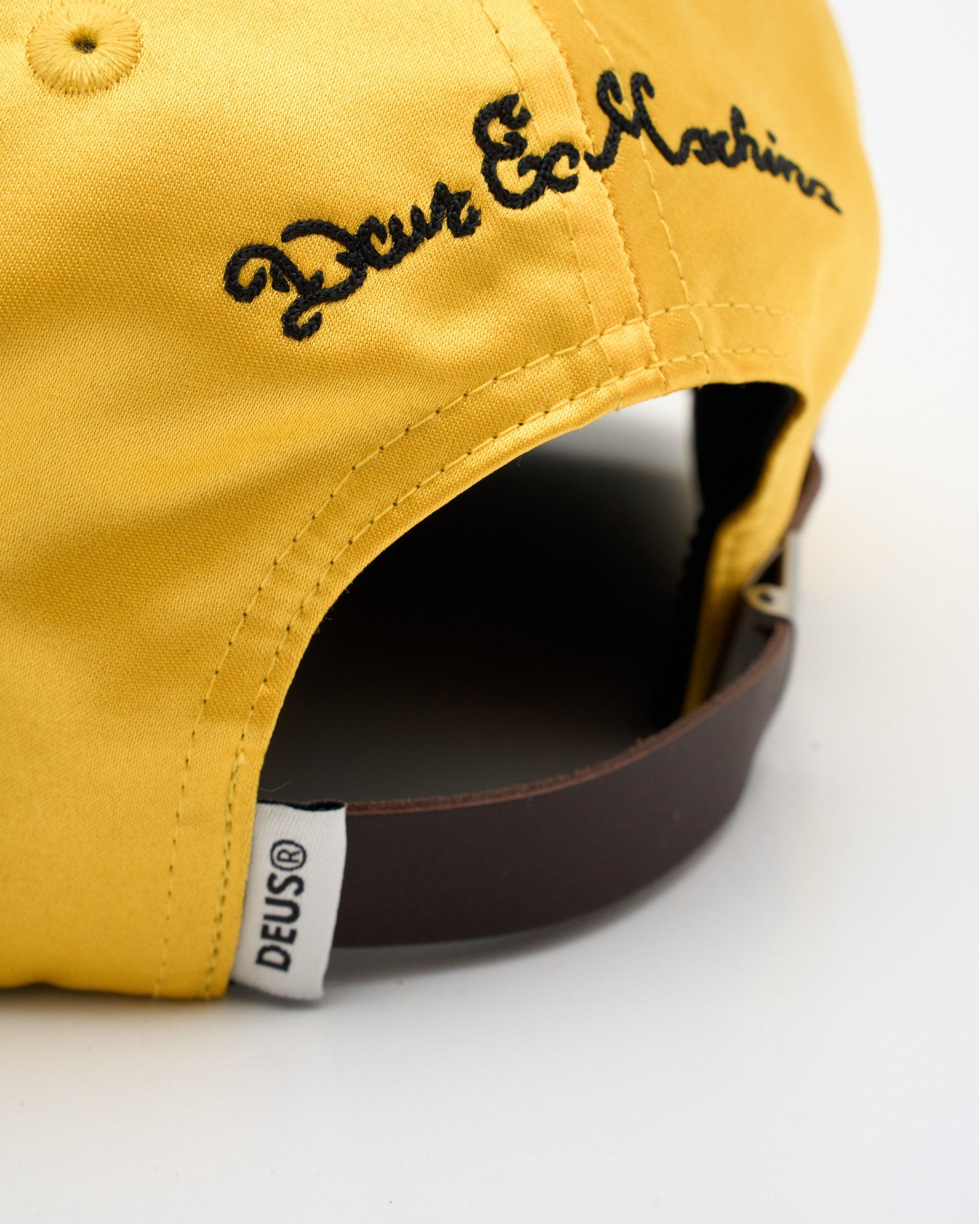 Deep Fit Pinch Front Hat With Chainstitch Embroidery On Front Panel And Visor And Leather Strap Closure In Satin Fabrication