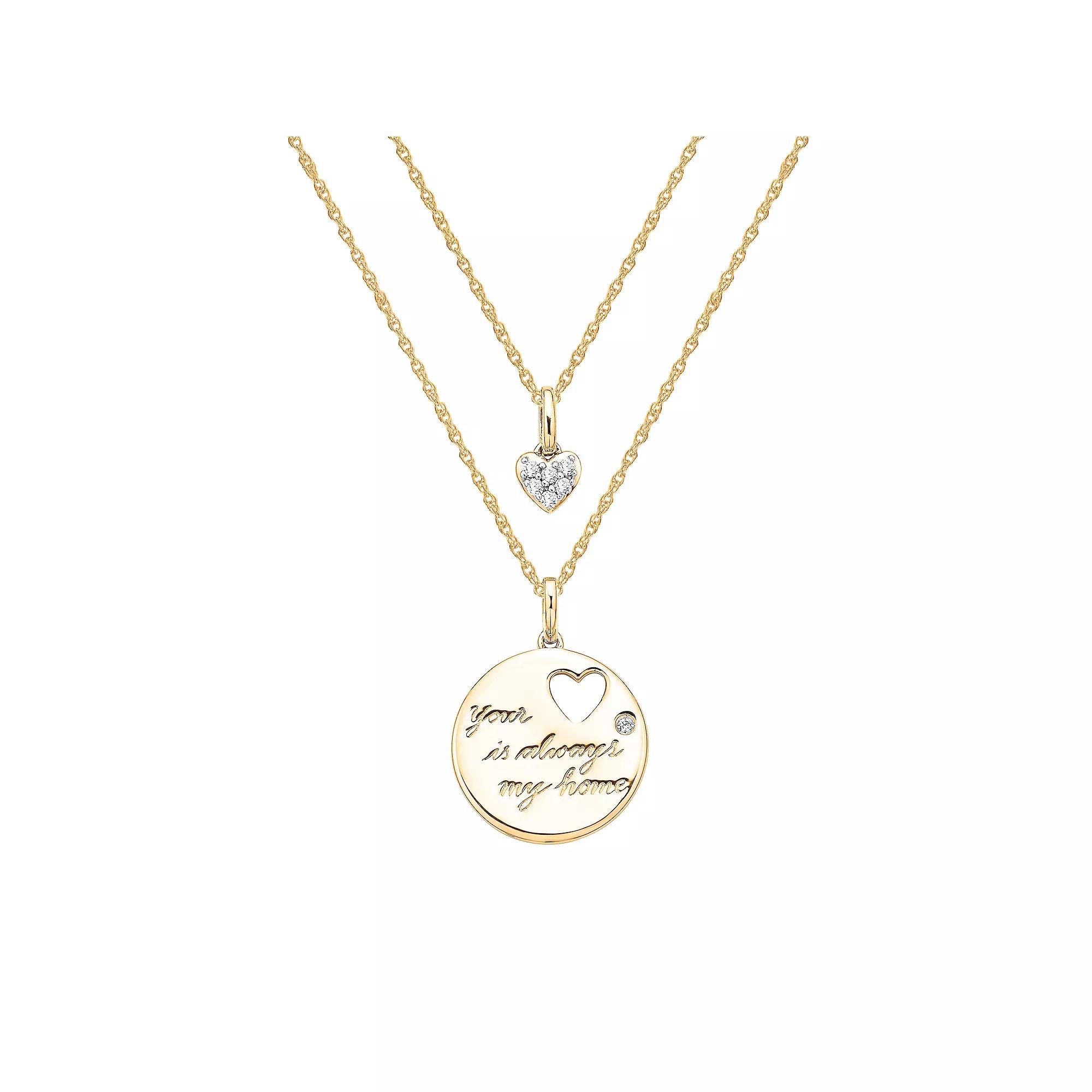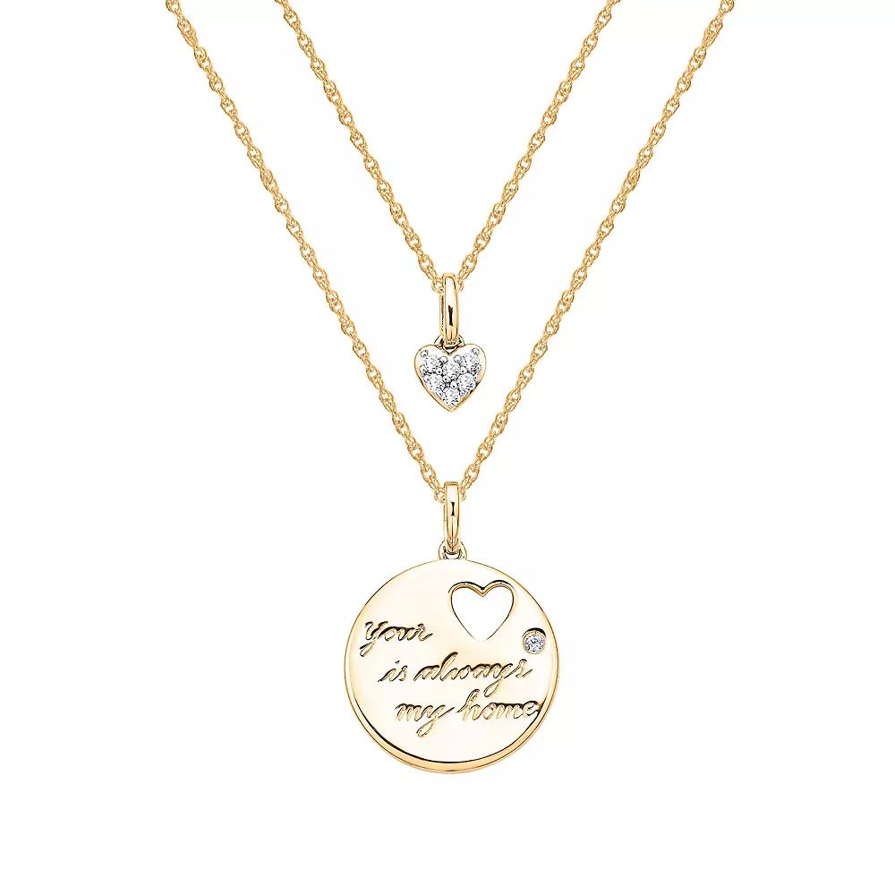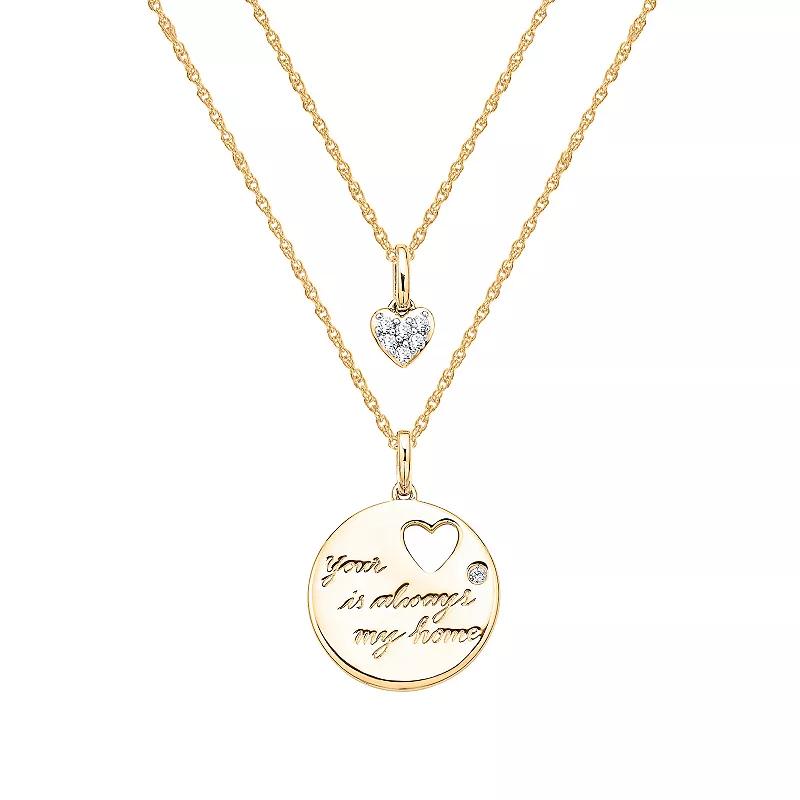 Featuring a lovely inscription and sparkling diamond accents, this sterling silver pendant necklace makes a perfect gift for mother and daughter. Featuring a lovely inscription and sparkling diamond accents, this sterling silver pendant necklace makes a perfect gift for mother and daughter. Pendant size: 0.7"L x 0.7"W Chain length: 18 in. (Mother) Chain length: 16 in. (Daughter) Chain type: rope Nickel free Metal: sterling silver Finish: polished Inscription: "Your Heart Is Always My Home" Packaging: boxedDIAMOND DETAILS Total weight: 1/10 ct. Color grade: I-J Clarity: I2-I3 Shape: round Setting: prong Diamond weights are approximate. Diamond Total Weights may vary between .01 and .13 ct. Some diamonds consist of fewer than 17 facets. Image(s) may be enlarged to show detail. Please note, due to the high value of this item, a signature may be required upon delivery. Size: 18". Color: Yellow. Gender: female. Age Group: adult. Material: Gold Over Sterling.