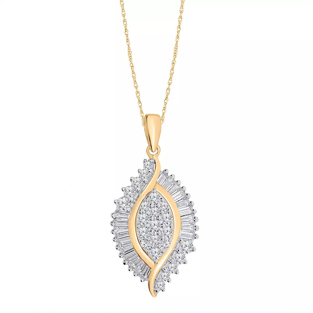 Round-cut diamonds and diamond baguettes set in a chic marquise design give this pendant necklace a stylish, contemporary vibe. Round-cut diamonds and diamond baguettes set in a chic marquise design give this pendant necklace a stylish, contemporary vibe. Pendant size: 0.551" x 0.551" Chain length: 18-in. Chain type: rope Metal: 10k gold Finish: polished Packaging: boxed Nickel freeDIAMOND DETAILS Total weight: 1 ct. Color grade: I-JClarity: I2-I3 Shape: baguette, round Setting: prong Diamond weights are approximate. Diamond Total Weights may vary between .01 and .13 ct. Some diamonds consist of fewer than 17 facets. Image(s) may be enlarged to show detail. Please note, due to the high value of this item, a signature may be required upon delivery. Size: 18". Color: Yellow. Gender: female. Age Group: adult.