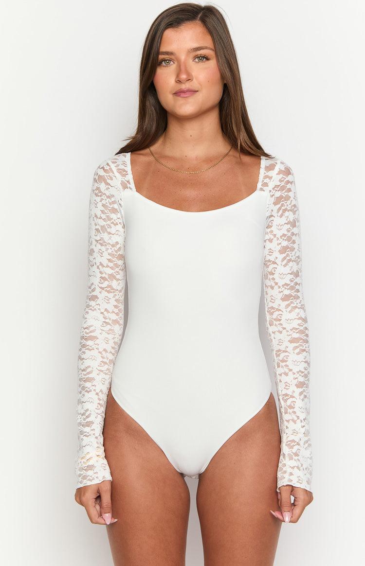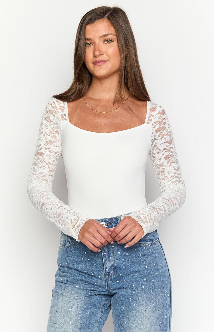 White Lace Long Sleeve BodysuitHow to style:Effortlessly elevate your wardrobe with our Irene Bodysuit! The delicate lace sleeves and body con fit add the perfect mix of elegance and edge to any look, making it a go-to for everything from a night out to a date night. Tuck it into high-waisted jeans or a sleek skirt for an easy yet stylish look!Features: Lace sleeves upper back panel Square neckline Lined bodice Long sleeves Body con fit Lots of stretch Lightweight material