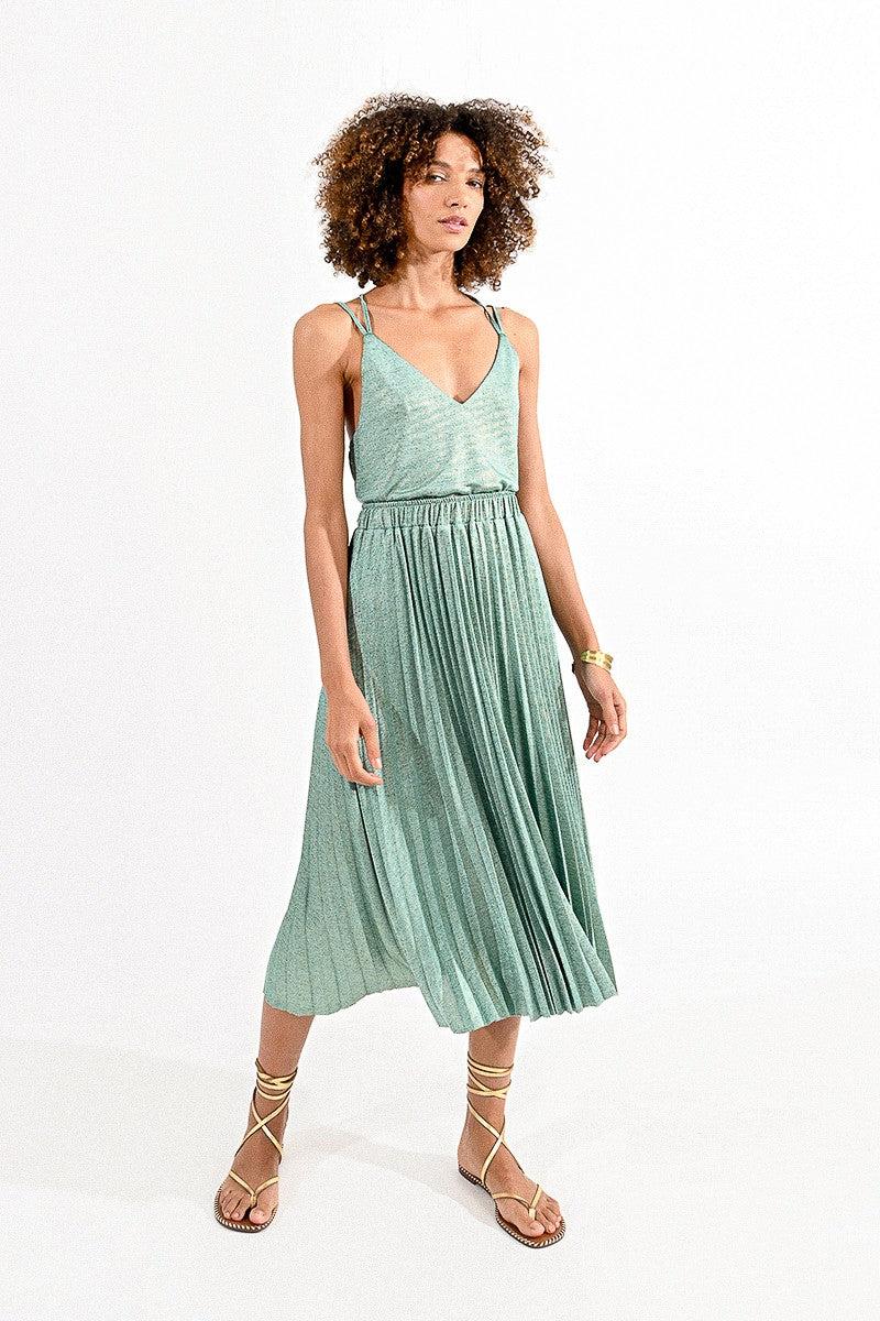*Skirt with multicolored crystals embellishments in front *High rise fit *Mini Skirt *Pleated Skirts *Embellished crystal design *A-line silhouette *Hem falls above the knee *Elastic waist back *Fully lined