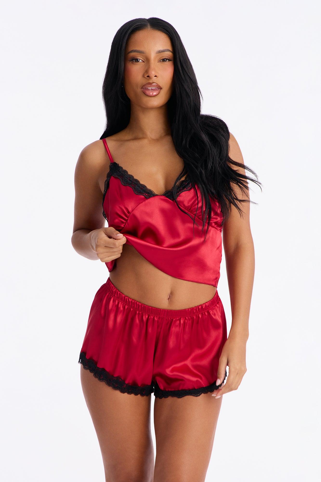 Available In Burgundy. 2 Piece Cami Set Satin Lace Trim Adjustable Straps Matching Short Bottoms Stretch Final Sale Self: 100% Polyester Lace: 95% Nylon 5% Spandex Imported California Proposition 65WARNING: Cancer and Reproductive Harm - www.P65Warnings.ca.gov.