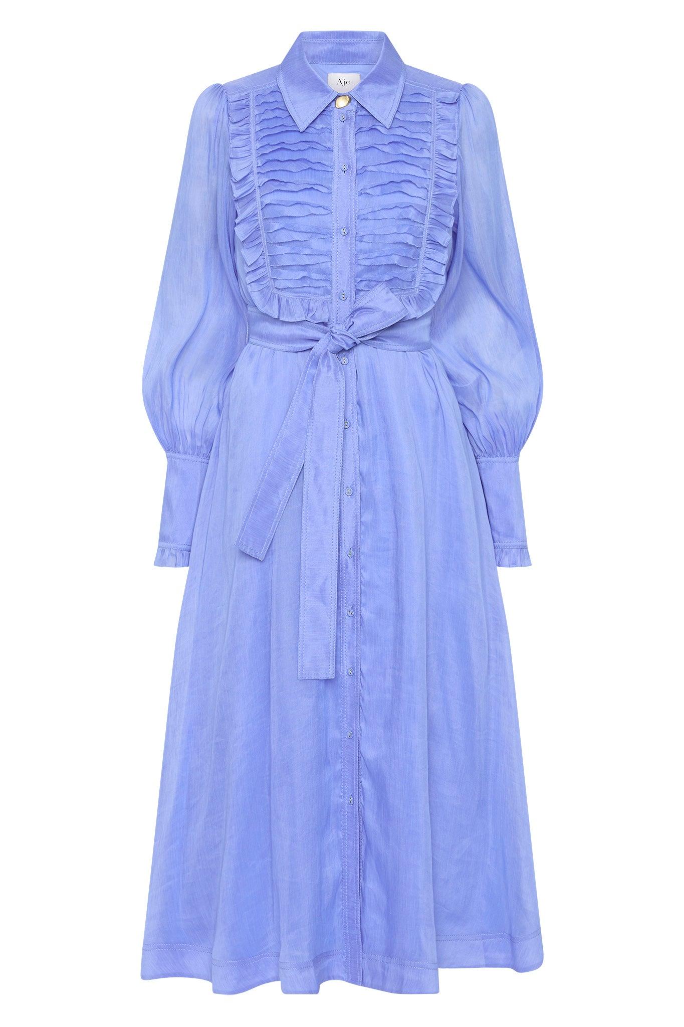 PRODUCT DETAILS Women's midi dress Shirt collar with gold accent button Blouson sleeves Ruffled cuffs Front button up placket Pleated ruffle bib Tie belt Flared skirt Lined style Shop All Dresses SIZE AND FIT Model wears a size 8/S Model: 170cm/5'7 Bust: 82cm Waist: 62cm Hips: 92cm FABRICATION 100% polyester organza, 100% cotton poplin Delicate Cold Hand Wash