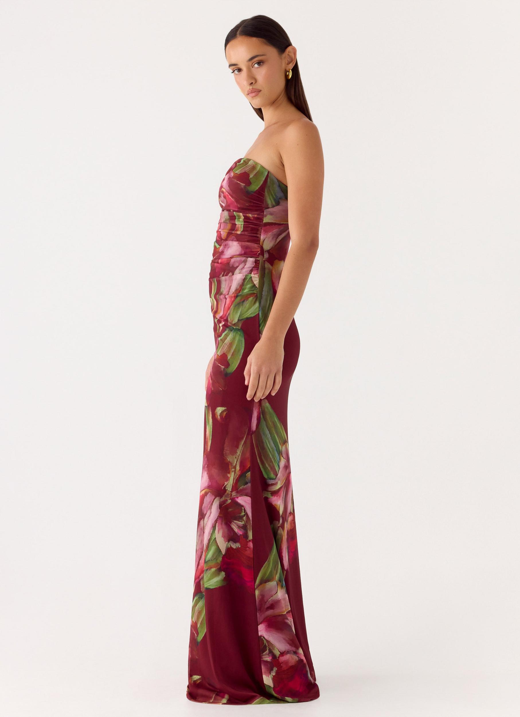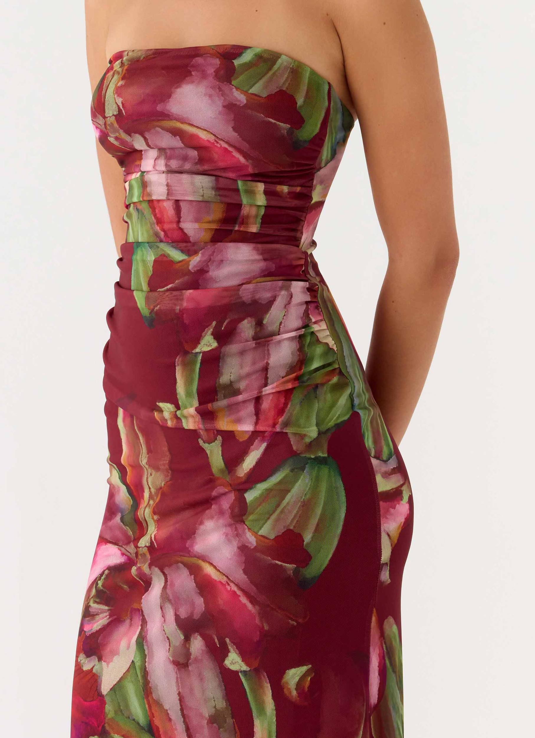 Peppermayo Exclusive The Iroha Strapless Maxi Dress is made for evenings that flow effortlessly from sunset to after-dark sophistication. Featuring a strapless neckline with silicone taping and ruched sides, this maxi-length style skims the body in stretch mesh for a flattering, confident fit. Fully lined with an exclusive print, it’s an editorial-ready silhouette perfect for warm nights. - Maxi length- Strapless neckline with silicone taping- Ruched sides- Fully lined- Exclusive print (print placement may differ)- Fabric: Main: 95% Polyester, 5% Elastane, Lining: 100% Polyester Size AU 8 / US 4 garment measurements:Bust: 68 cm / 26.77 inWaist: 60 cm / 23.62 inHip: 80 cm / 31.50 inHem: 172 cm / 67.72 inLength: 141 cm / 55.51 in Roberta is 177cm and wears size AU 6 / size US 2