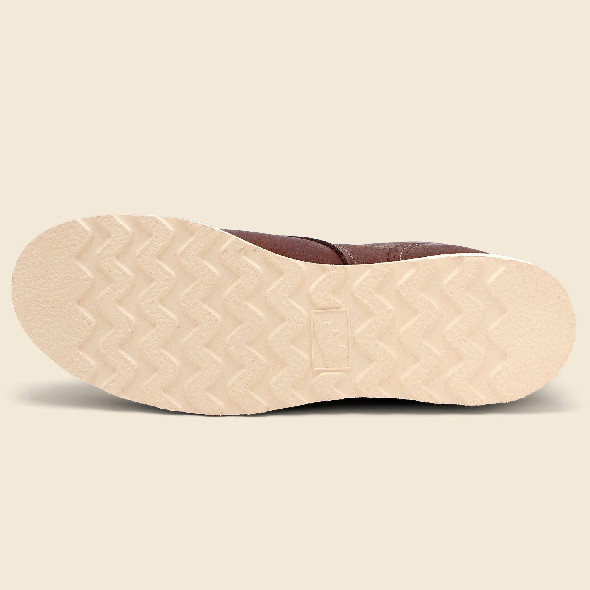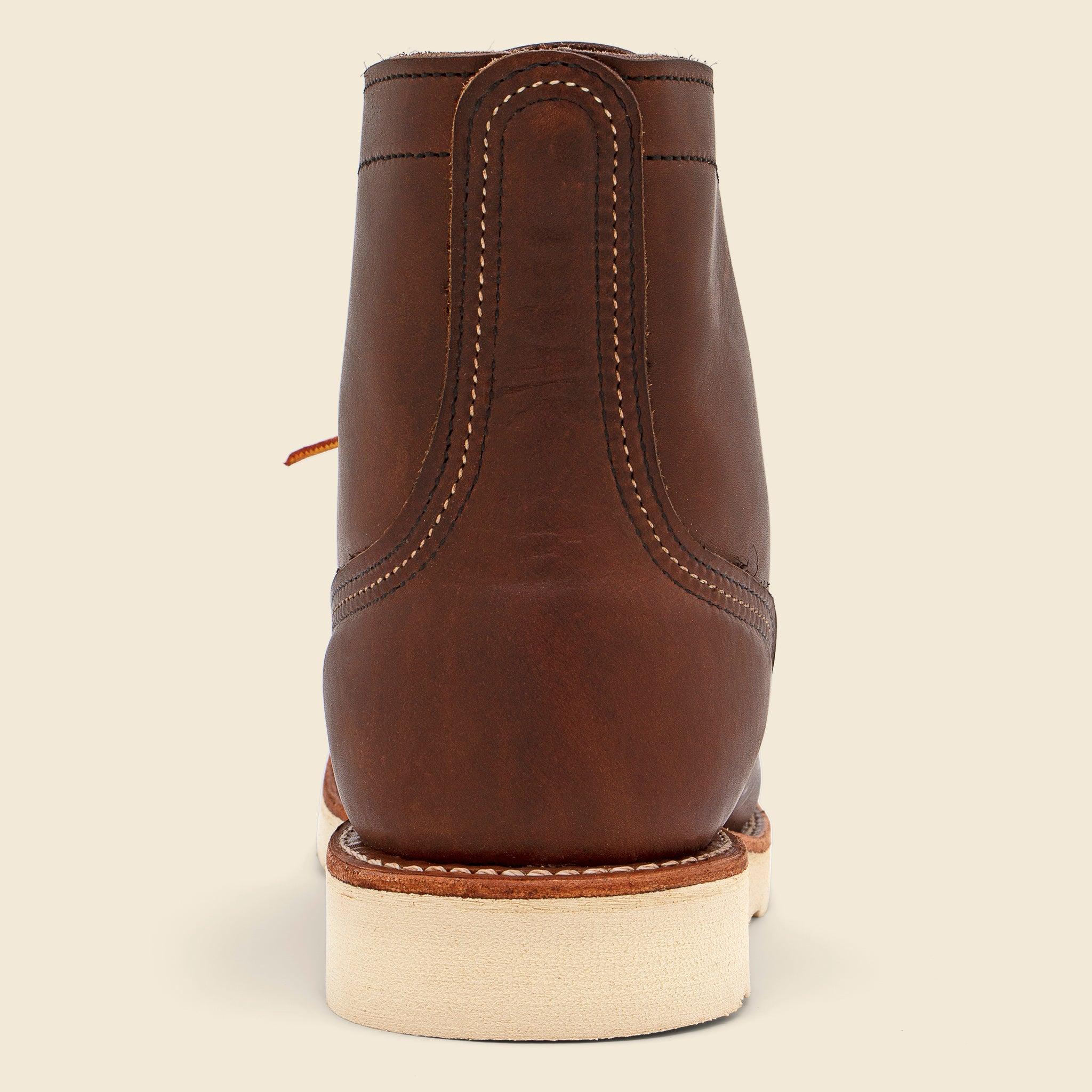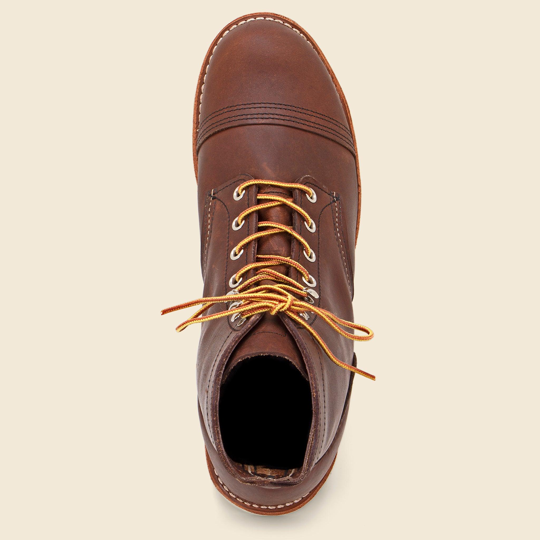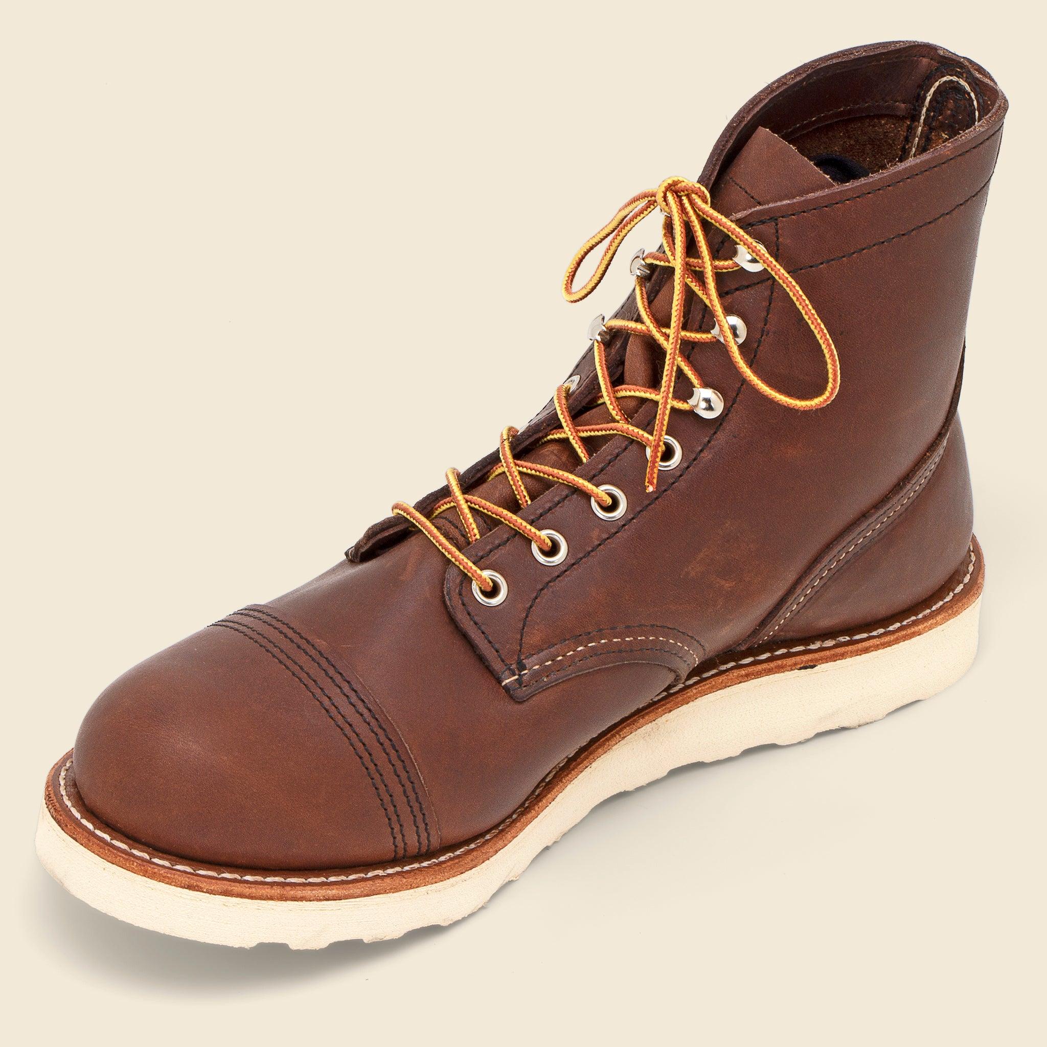 The 8088 combines the iconic silhouette of the Iron Ranger with the comfort and durability of a Traction Tred outsole to offer an elevated take on a Red Wing Heritage classic. Made with premium Amber leather and a Goodyear welt construction, these boots are made to last and feature nickel eyelets and speed hooks for easy lace-up, triple-stitching detail, and a leather insole that forms to the shape of your foot over time for a comfortable finish. Rugged 6-inch boot Features a bump toe for more room up-front Fits a variety of foot shapes Full-grain Amber Leather Traction Tred outsole Leather insole forms to the shape of your foot over time Nickel eyelets and hooks Goodyear welt construction Steel shank 48-inch Taslan Laces Many customers buy Red Wing Heritage footwear 1/2 size smaller than their normal size Made in USA Materials: Upper: Leather | Sole: Red Wing Heritage Traction Tred