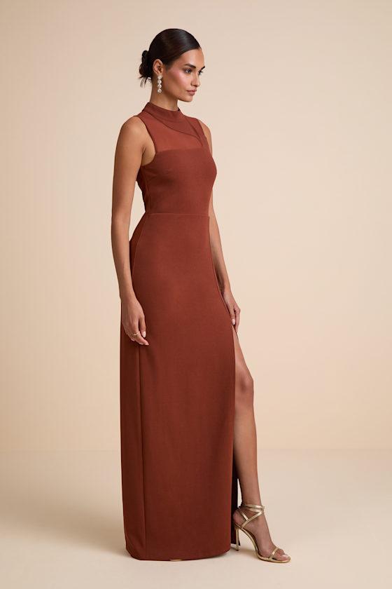 Watch everyone marvel over your style all evening long in the Lulus Irresistibly Modern Rust Brown Mesh Mock Neck Maxi Dress! Figure-flattering crepe knit shapes a chic mock neckline and a sleeveless, darted bodice with a sheer mesh design across the décolletage and shoulders. High, fitted waist sits atop a figure-skimming column skirt with a maxi hem and an alluring side slit. Hidden back zipper/clasp.
