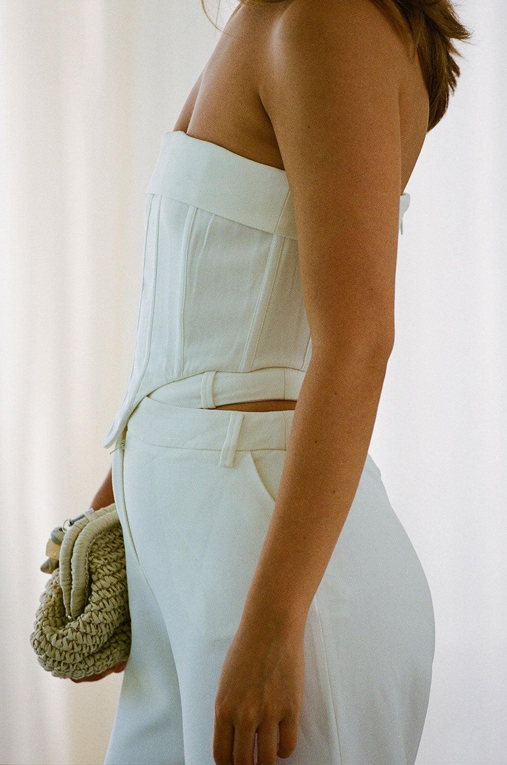 Wear it as a set or style it with relaxed jeans! The Isabela Top is made from a suiting fabric in white. It is a strapless style featuring a folded panel across neckline, boning throughout for added structural support and a curved waist. Get the set and pair with the Isabela Pants and style with the Peyton Mules! Designed exclusively by Sabo.