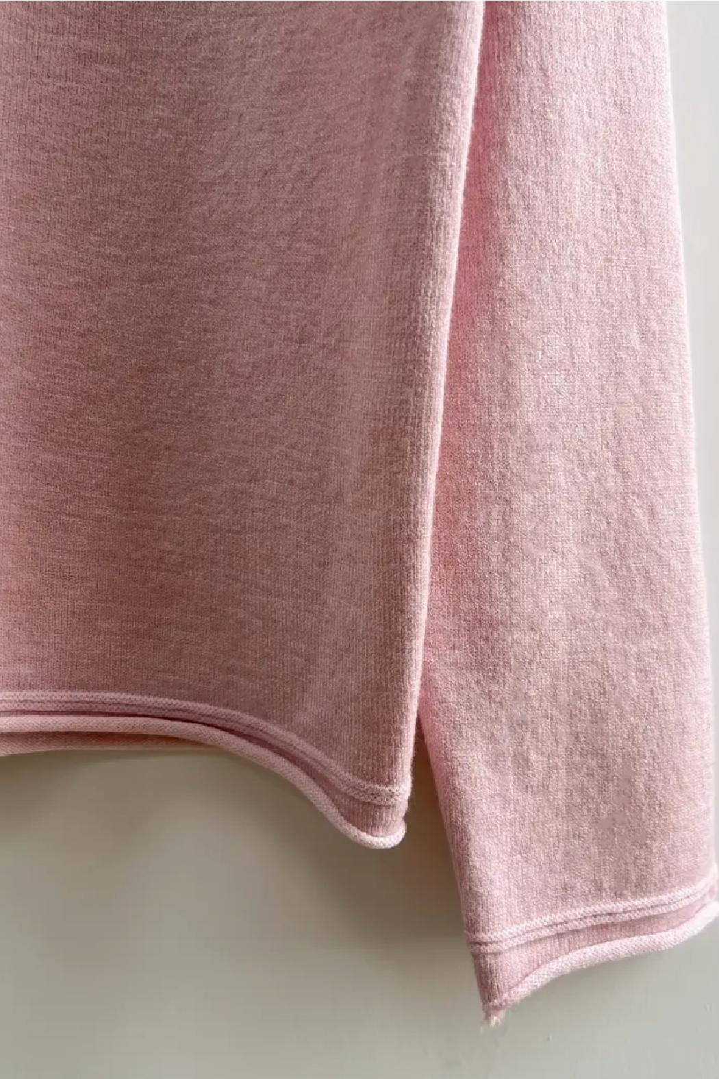 Soft, cashmere like, micro-ribbed knit sweater with raw edge detail on cuffs and turtleneck neckline.