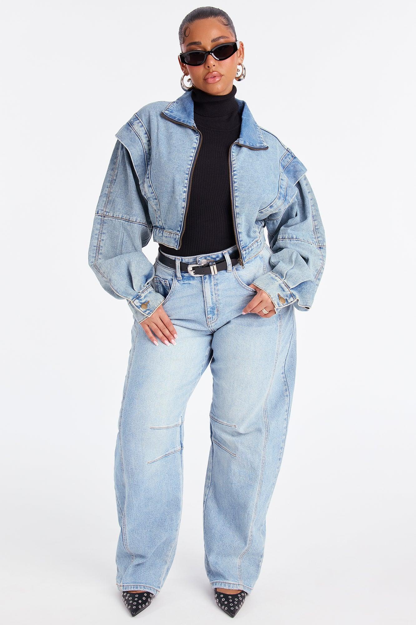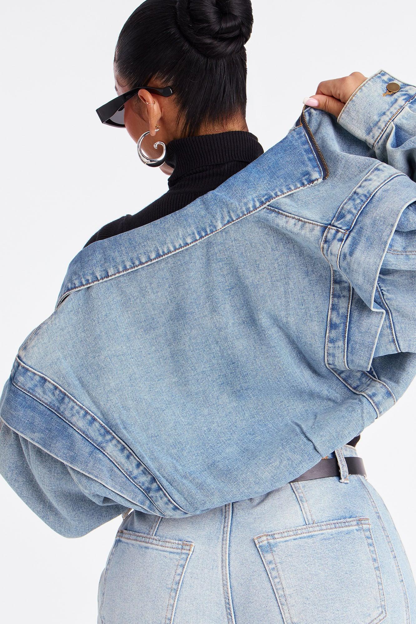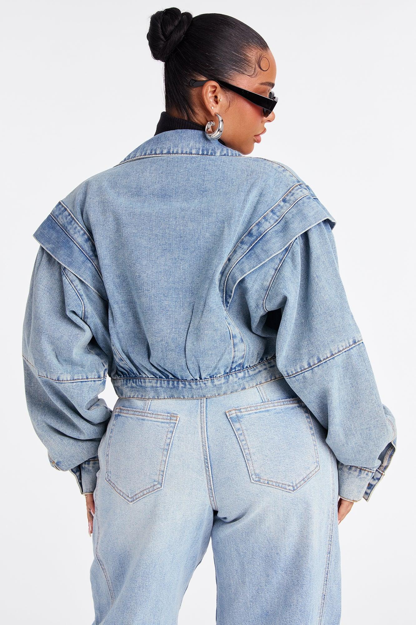 Available In Vintage Wash. Denim Bomber Jacket Collar Long Sleeve Cropped Zipper Closure Denim Rigid Disclaimer: Due To The Specialized Wash Process, Each Garment Is Unique. Self: 90% Cotton 10% Polyester Imported California Proposition 65WARNING: Cancer and Reproductive Harm - www.P65Warnings.ca.gov.