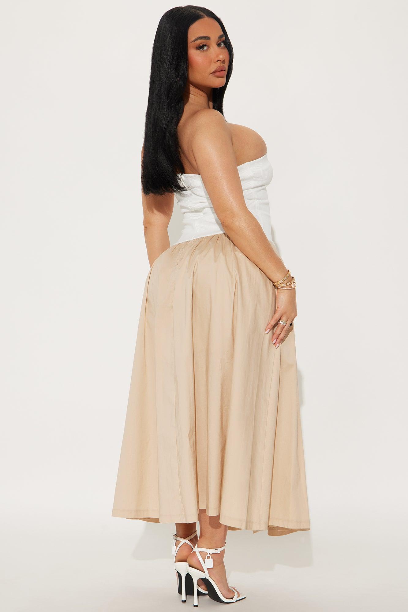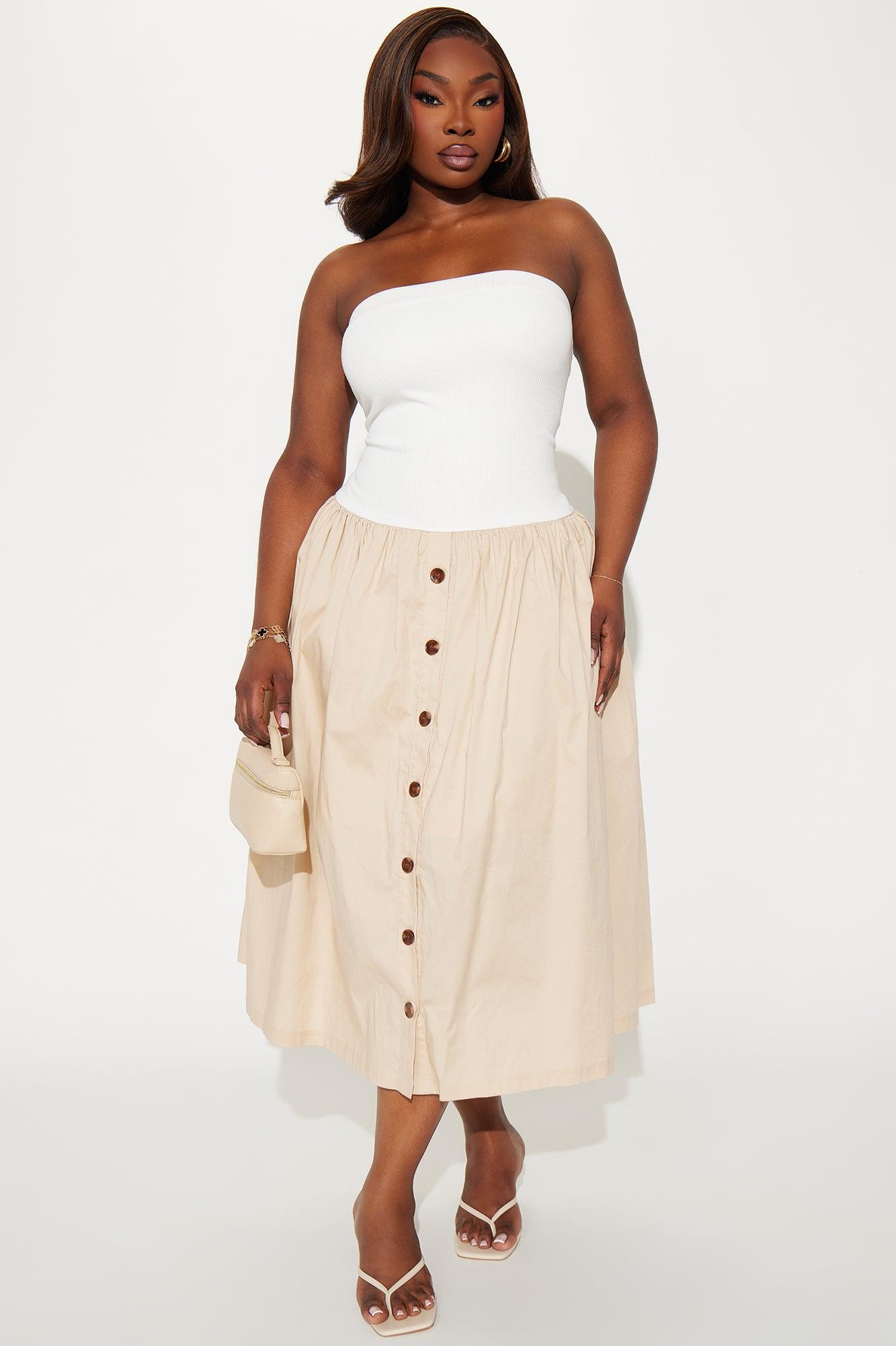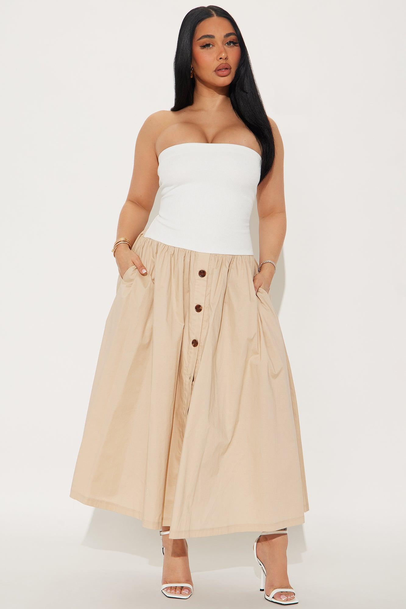Available In Khaki/combo. Button Up Midi Dress Straight neckline Strapless Button up Pockets Back zipper Stretch Half lined skirt Length measured flat = 42" Self: 97% Cotton 3% Spandex Contrast: 70% Polyester 26% Viscose 4% Spandex Lining: 100% Polyester Imported California Proposition 65WARNING: Cancer and Reproductive Harm - www.P65Warnings.ca.gov.