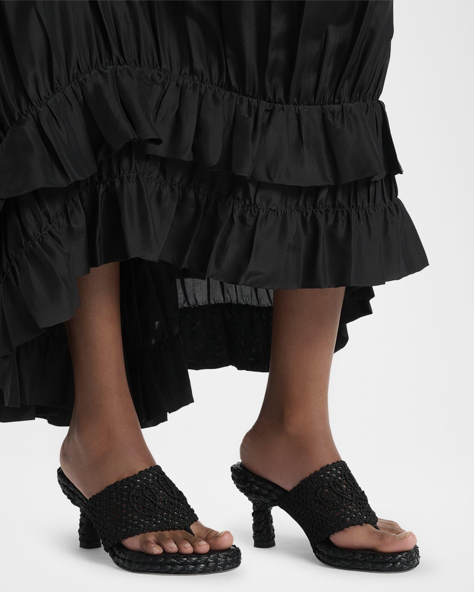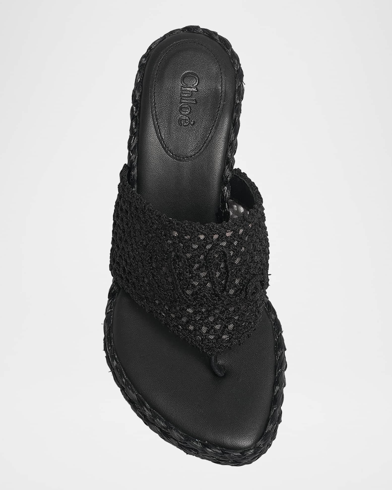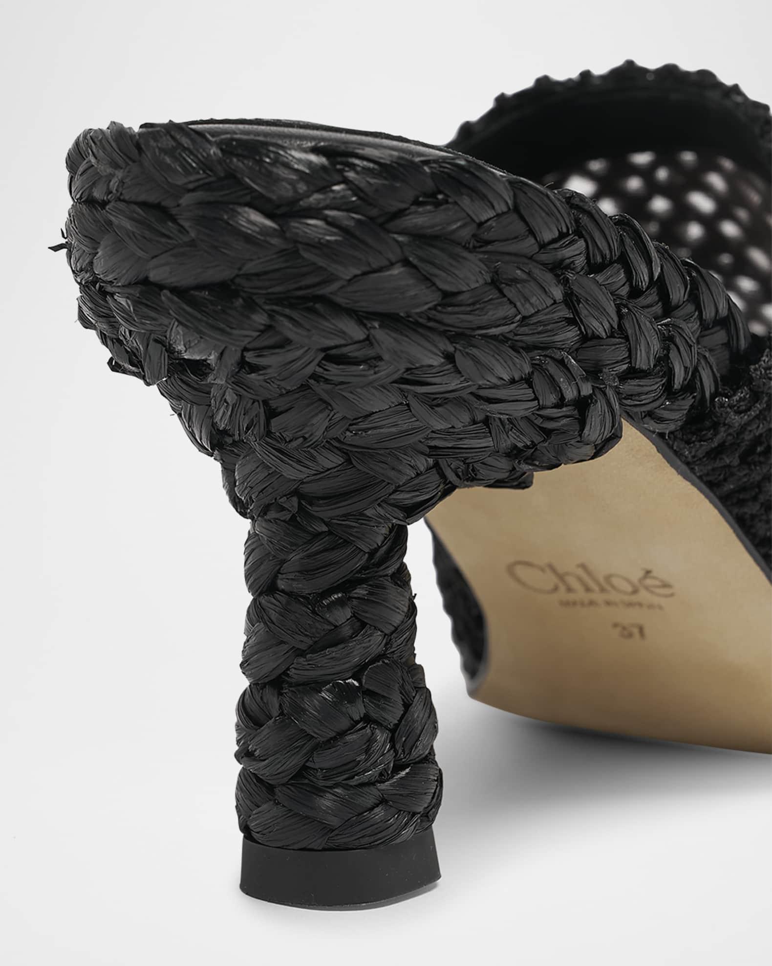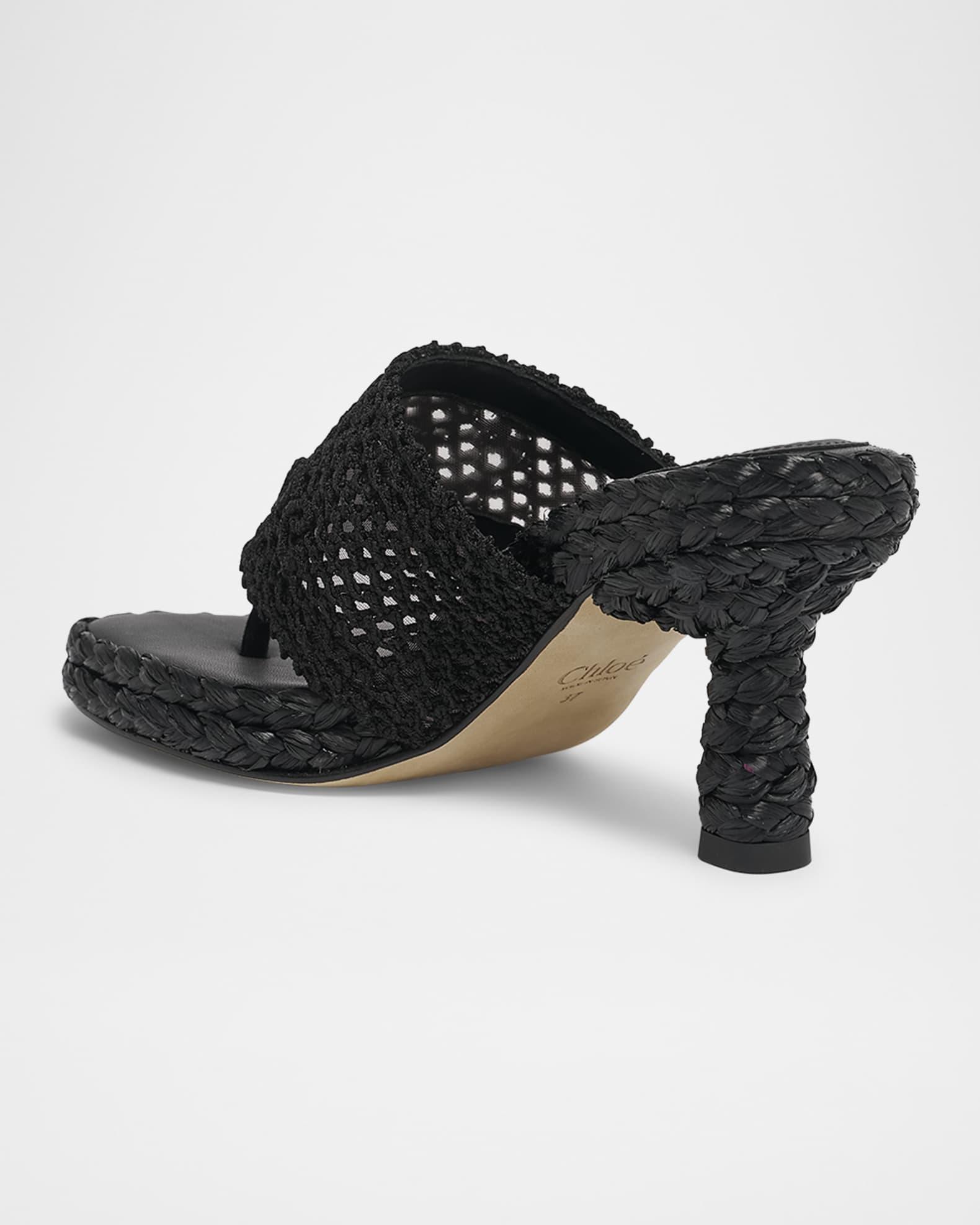 Chloe sandals in lambskin leather, braided raffia and a viscose crochet upper with tonal logo signature 3.00 in / 75 mm comma heel Open toe Thong strap Slip-on style Leather outsole Lining: Leather Professional cleaning recommended Made in Spain