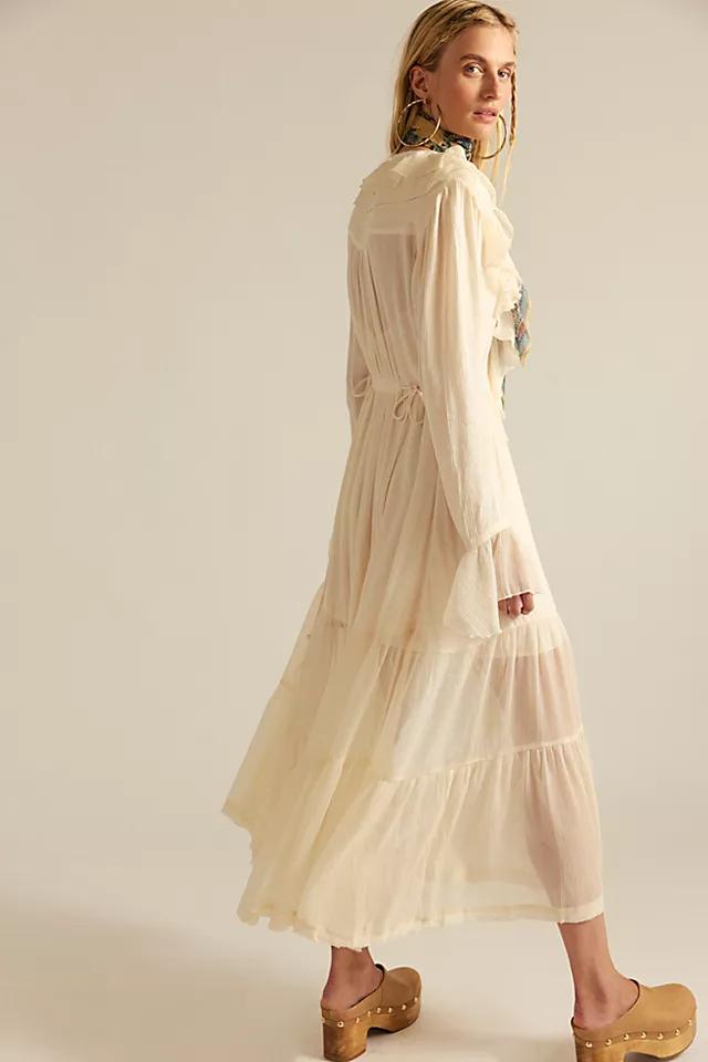Effortless romance is yours with this ethereal long-sleeve midi dress, featuring a billowy A-line silhouette, airy semi-sheer fabrication, and ruffle detailing for an added touch of elegance.