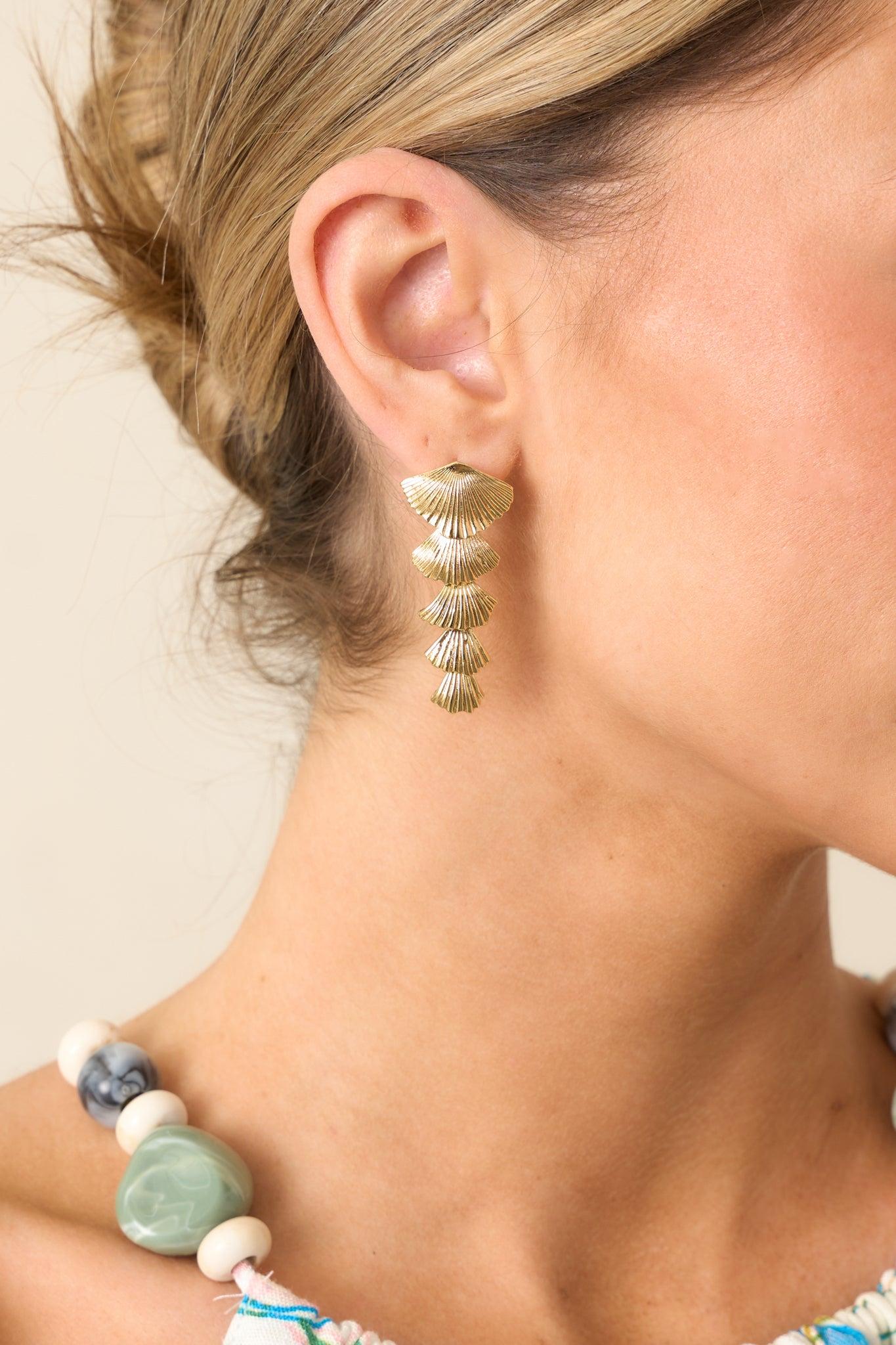 Upgrade your vacation look with our Island Getaway Gold Seashell Drop Earrings. These elegant earrings feature intricate seashell designs, adding a touch of coastal charm to any outfit. Slip them on for a day at the beach or a night out. Elevate your style with these statement earrings. These gold earrings feature a textured gold hardware, a stacked seashell drop design, a large seashell stud with each shell getting smaller as the stack increases, and secure back postings. These Earrings Measure: 1.75" Lead & Cadmium Compliant Manufactured in China