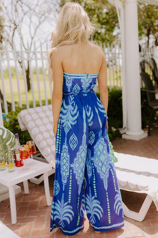 - Easygoing yet stylish, this wide leg jumpsuit is made for casual outings, brunch dates, and nights out with the girls! A one-and-done look that adds effortlessly chic vibes to your wardrobe with an extra dose of charm. - Lightweight material with an intricate print featuring a green hue and different shades of blue - A strapless neckline with an interior non-slip strip - A built-in bust lining - Back zip closure - A removable tie closure belt - Pleated details - Hidden side pockets - A wide leg silhouette that ends in straight hemlines