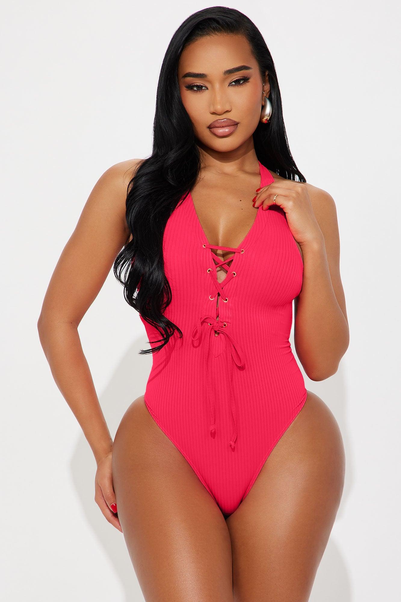 Available In Hot Pink. Ribbed 1 Piece Swimsuit Wide Straps Removable Cups Deep V-Neck Lace Up Cheeky Back Adjustable Ties Low Back Full Stretch Final Sale Shell: 90% Nylon 10% Spandex Lining: 86% Nylon 14% Spandex Imported