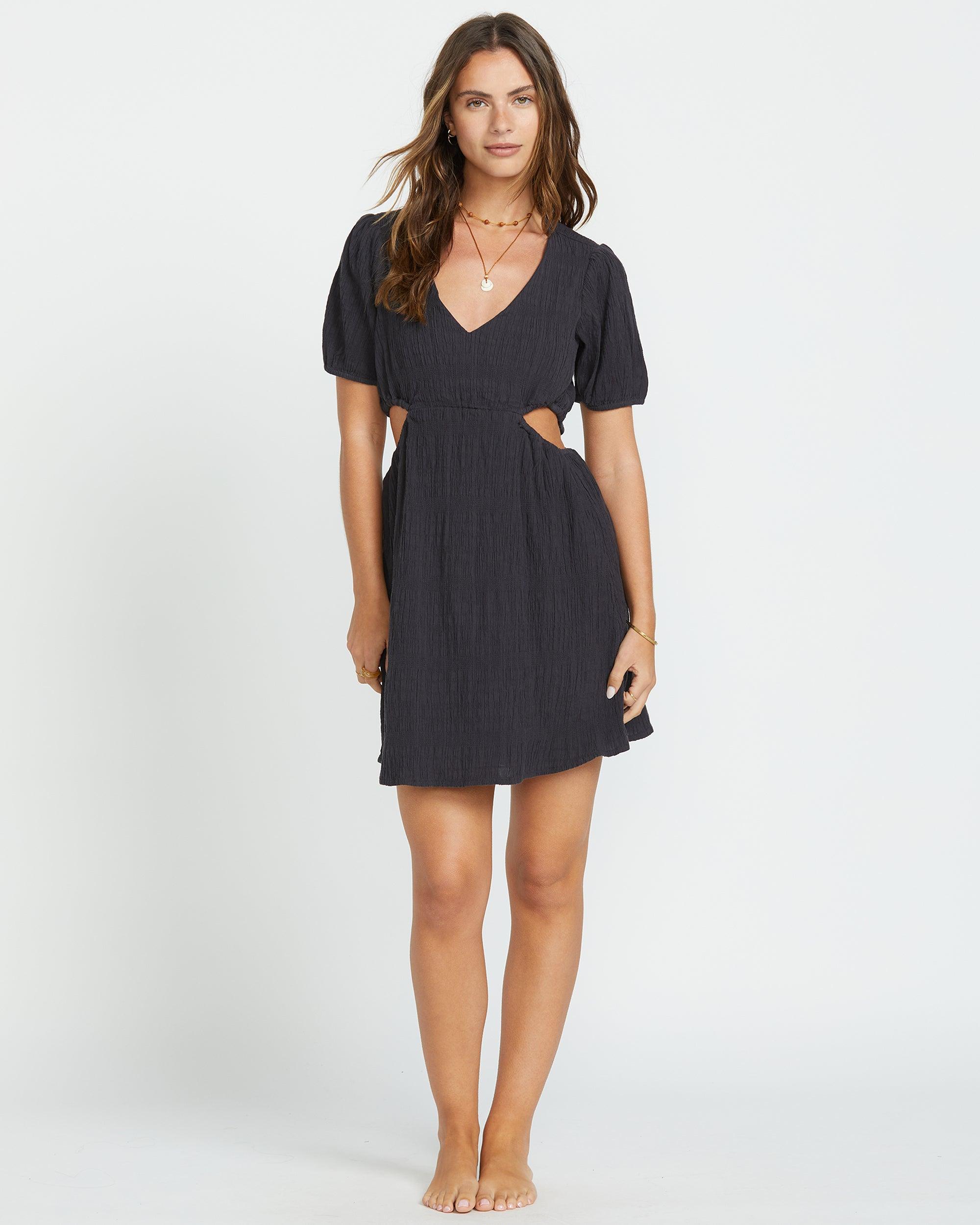 An ultra-feminine mini dress with a flirty side. Puff sleeves meet a sassy side cutout in this fit & flare cotton-blend style. Edgy metal plate detail balances the sweet puff sleeve and V-neck for a look that's both sassy and sweet. Featured here in the Black colorway. Features Mini dress 98% cotton, 2% elastane, textured fabric Fit & flare styling, HPS: 34" V-neck, short puff sleeves, cut-out detail at side seam Metal plate
