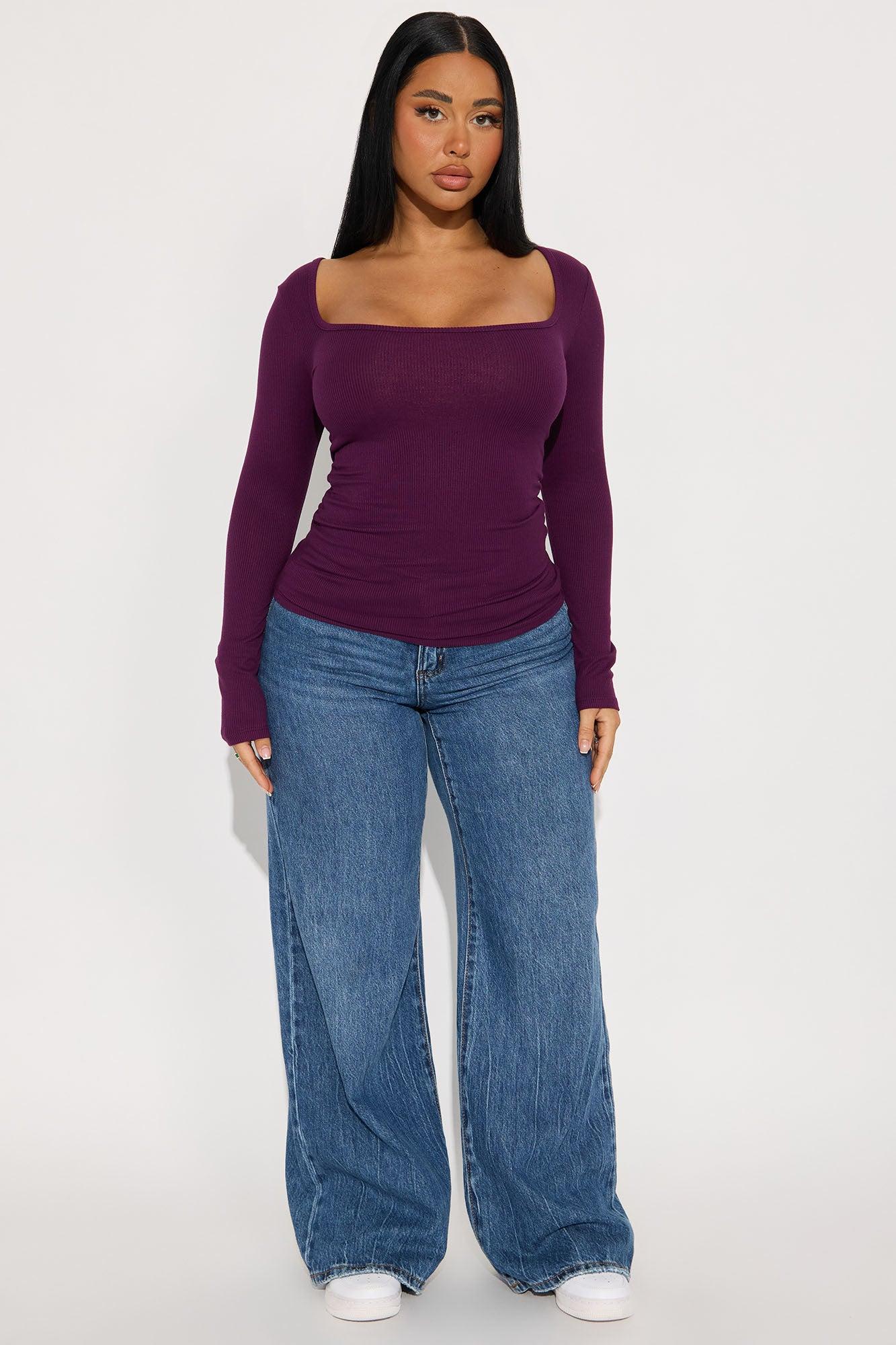 Available In Burgundy, Chocolate, Navy, Plum, Taupe And White. Knit Top Square Neck Long Sleeve Ribbed Stretch Self: 95% Rayon 5% Spandex Imported