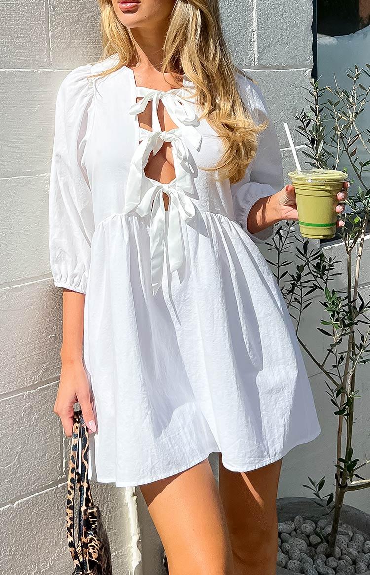 White Balloon Sleeve Mini DressHow to style:Effortlessly chic and feminine, the Issy White Mini Dress is perfect for all your favourite occasions. The lightweight material and flowy style make it comfortable for all-day wear, while the balloon sleeve style adds a touch of elegance. Complete the look with sandals and a bag, and wear it to brunch, a bridal shower, or any other special event.Features: Mini length Light weight material 3/4 length balloon sleeves Elastic sleeve cuff 3 centre front ribbon ties Fully lined Flowy style Pull on design Non stretch material