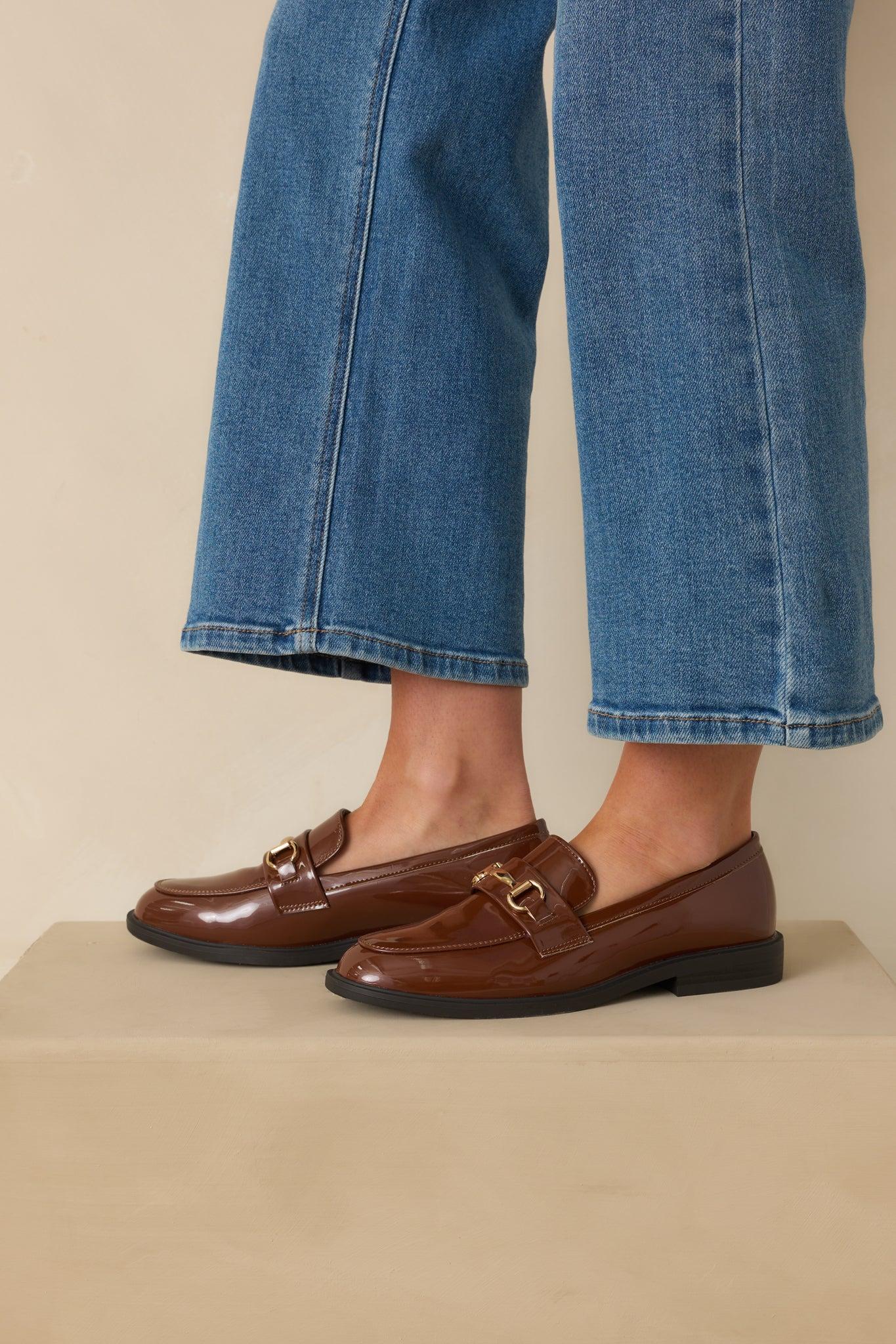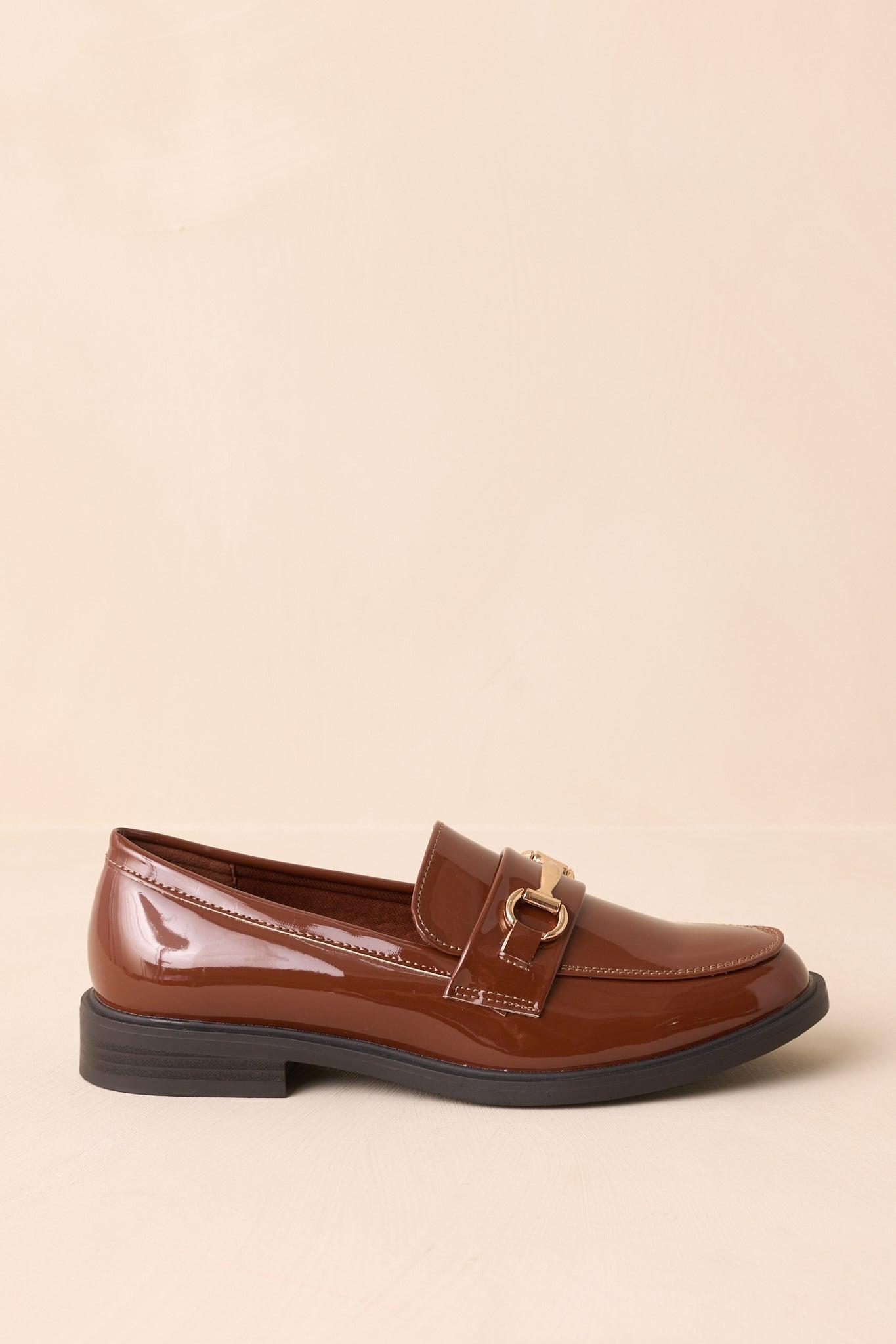 The It All Made Sense Brown Patent Faux Leather Loafers are that just-right mix of polish and ease. They’re stylish without trying too hard and always seem to pull the whole look together. These brown loafers feature a structured almond toe, a shiny patent finish, classic slip-on design, a gold-tone horsebit detail across the vamp, topstitch accents, and a black low stacked heel. Heel measures 1" Man-made Materials Non-skid sole Imported True to Size, Wide Foot Friendly