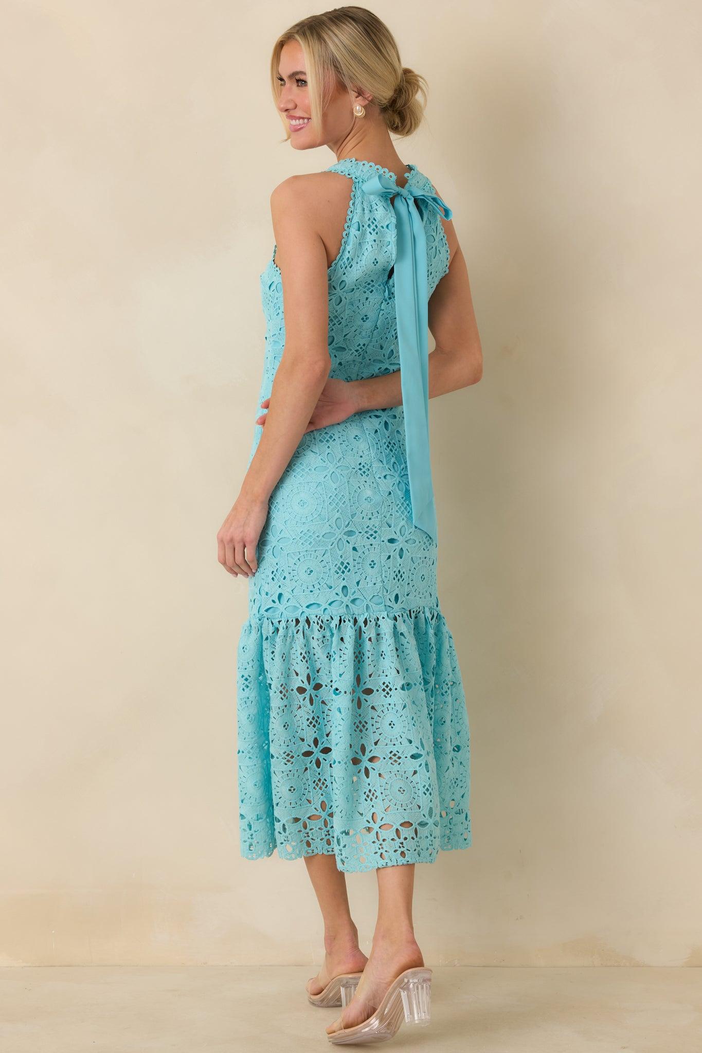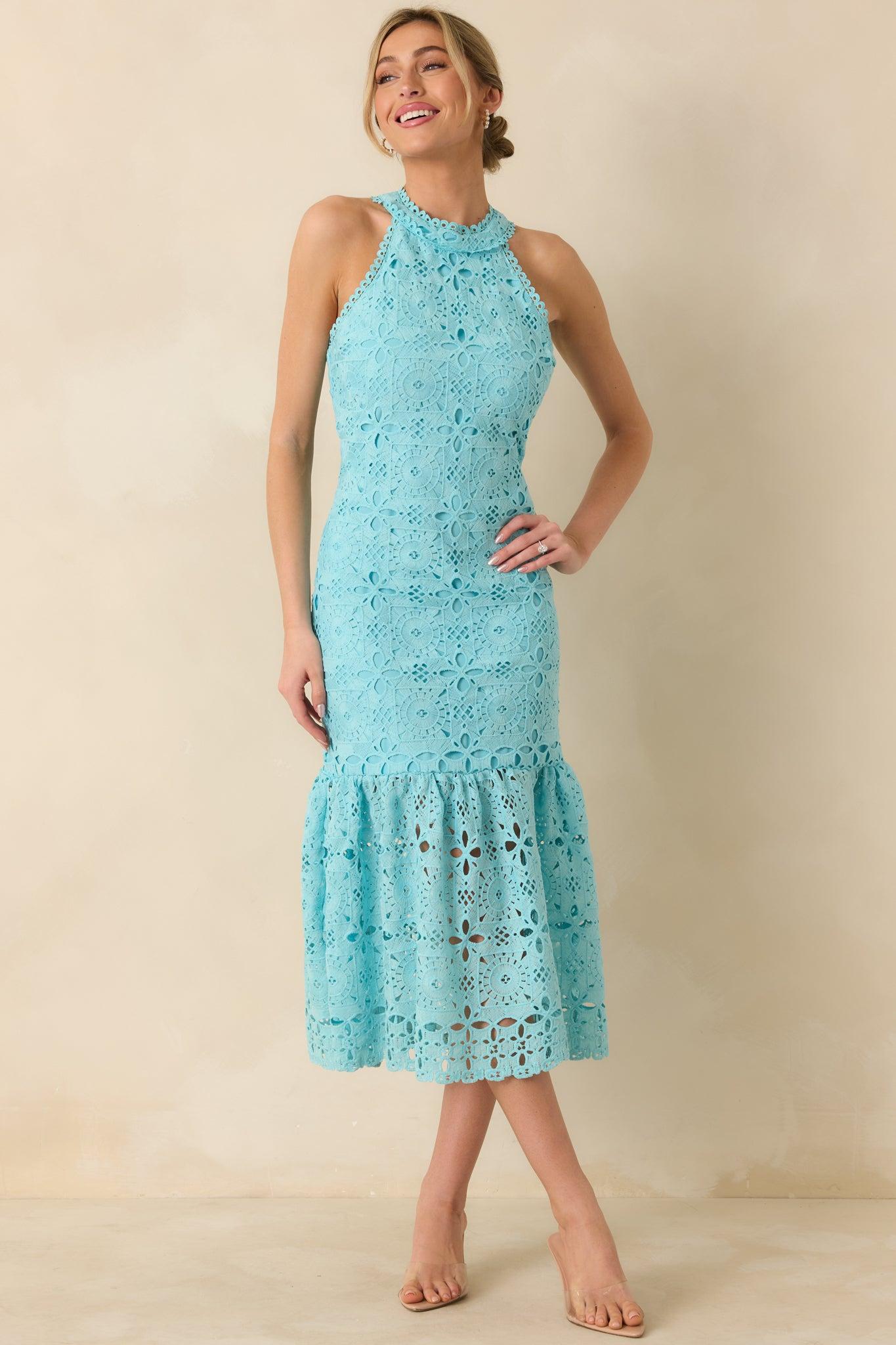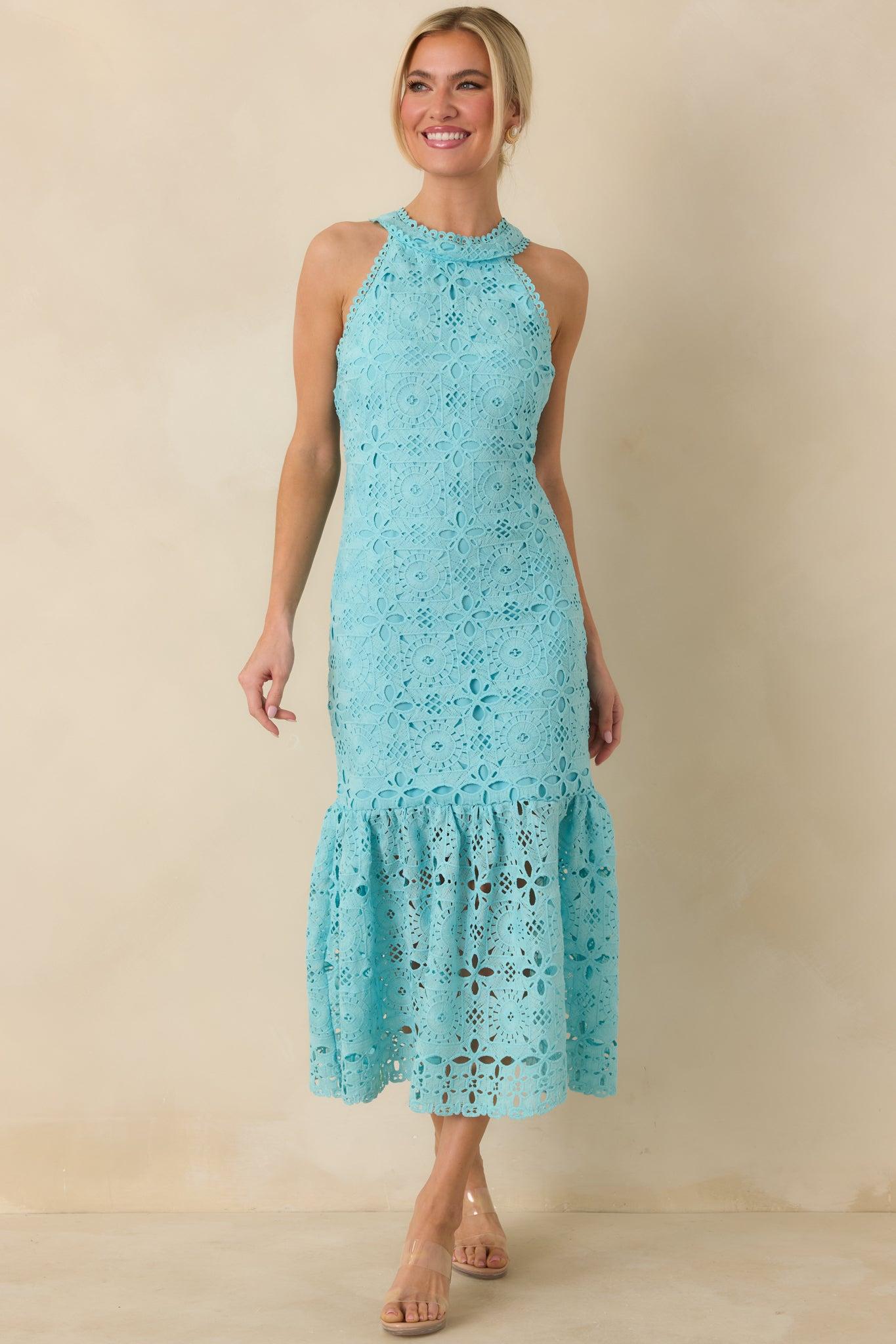 The It's A New Day Horizon Blue Floral Embroidered Maxi Dress is a standout piece that brings a fresh, uplifting feel to any occasion. Its intricate floral embroidery and blue hue create a look that’s both eye-catching and refined, perfect for making a memorable impression. This horizon blue maxi dress features a halter neckline, geometric floral embroidery, adjustable self-tie bow back closure, a fitted silhouette, flowy bottom tiered skirt, open eyelet detailing, and a hidden back zipper.