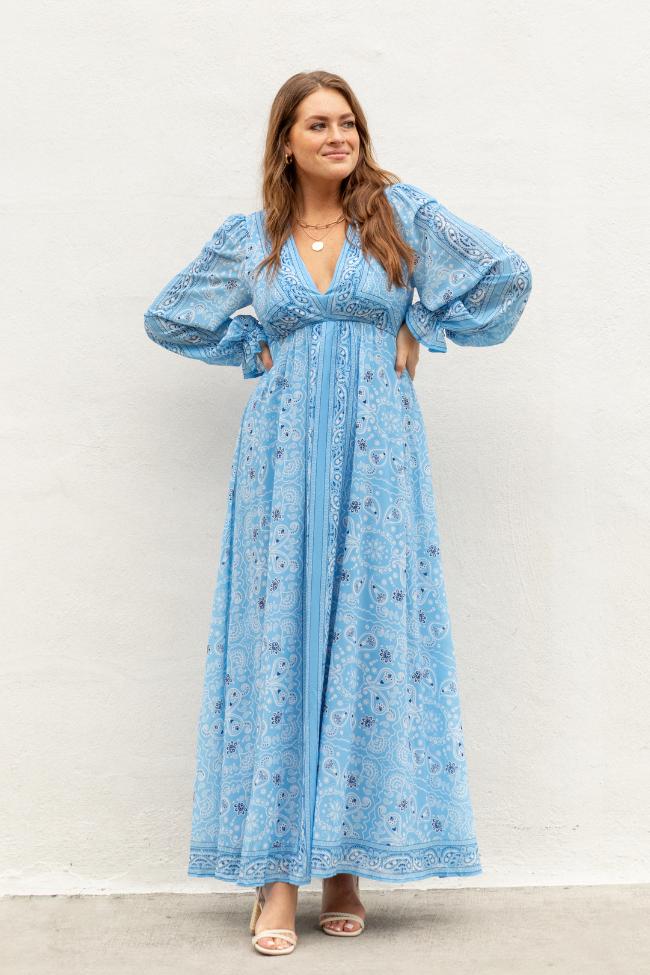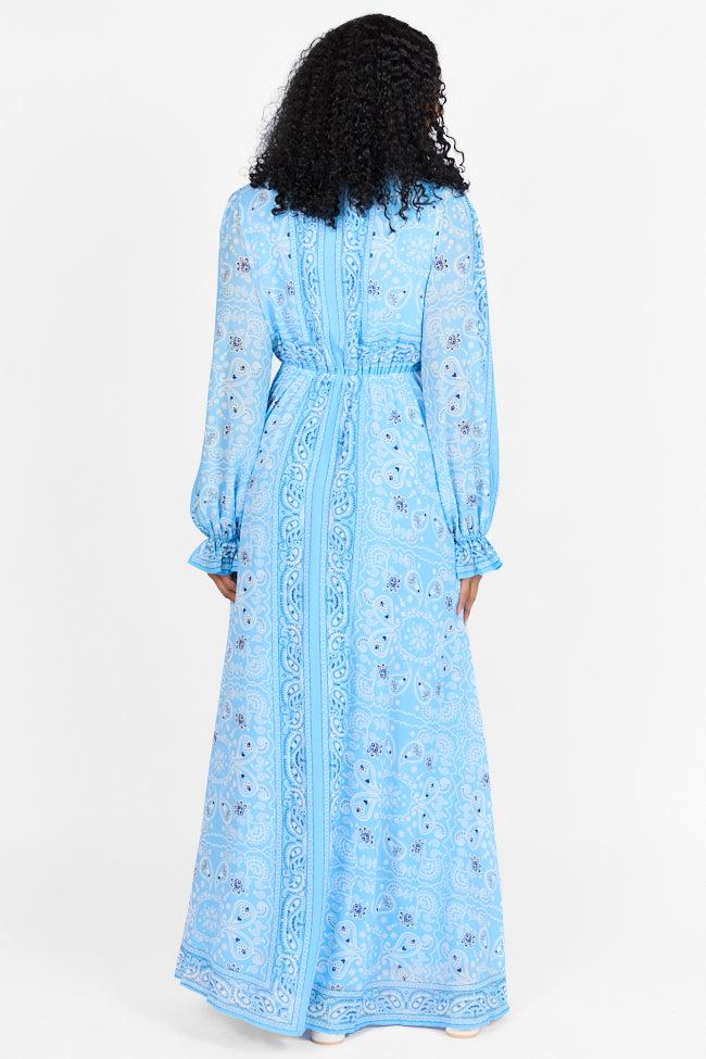Details Bandana Print Maxi Dress Fabric has stretch in elastic V-neckline, long sleeves, elastic waist Lined Size small from shoulder to hem: 56" Material and Care 100% polyester Hand wash cold, dry flat Patterns may vary Materials may have natural variations Colors may vary from different viewing devices.