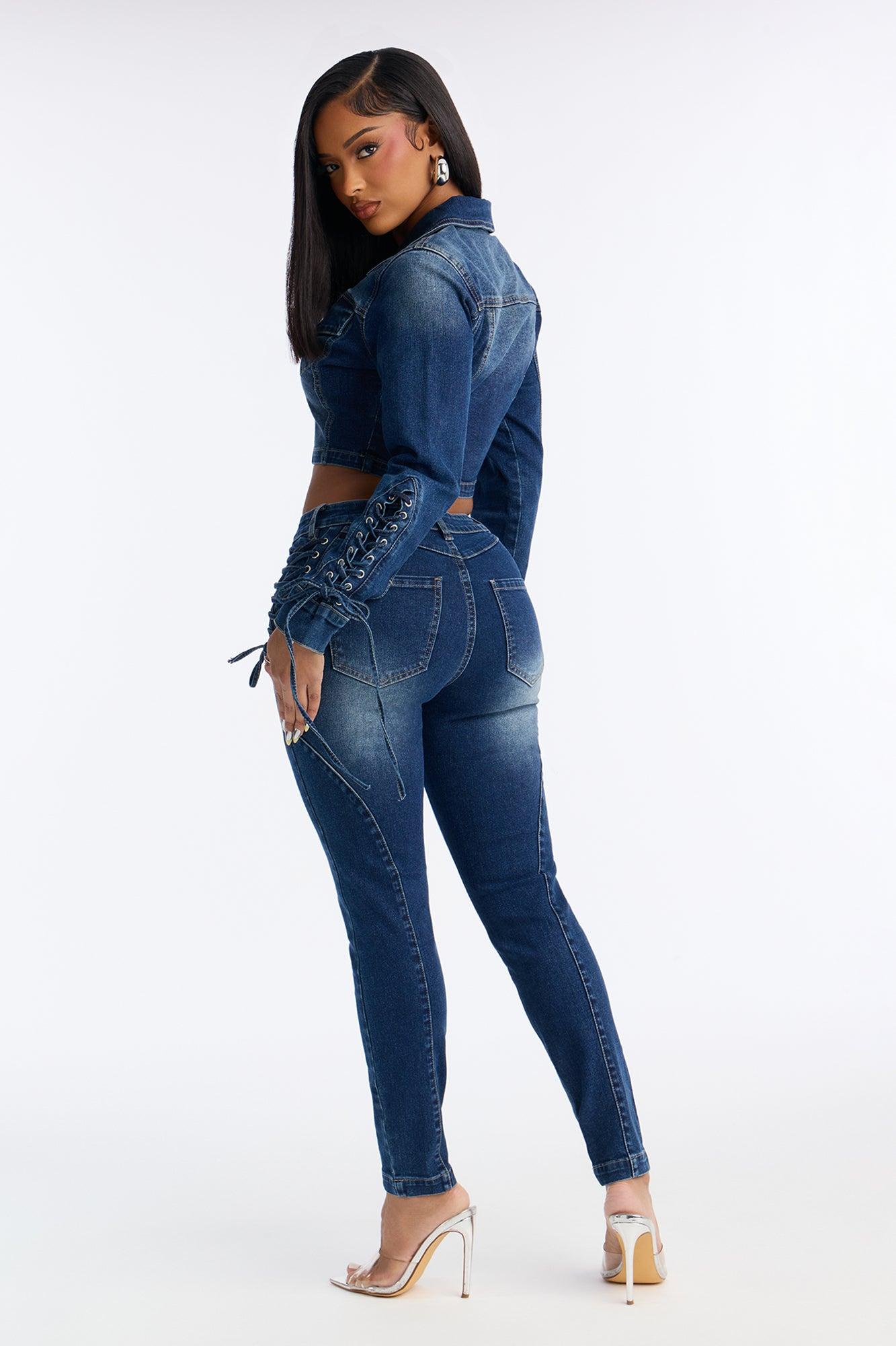 Available In Dark Wash. Skinny Jean Pair With It's Showtime Lace Up Denim Jacket To Complete The Look! Back Pockets Lace Up Detail Seaming 10" Rise 29" Inseam Medium Stretch Disclaimer: Due To The Specialized Wash Process, Each Garment Is Unique. Self: 70% Cotton 28.5% Polyester 1.5% Spandex Imported California Proposition 65WARNING: Cancer and Reproductive Harm - www.P65Warnings.ca.gov.