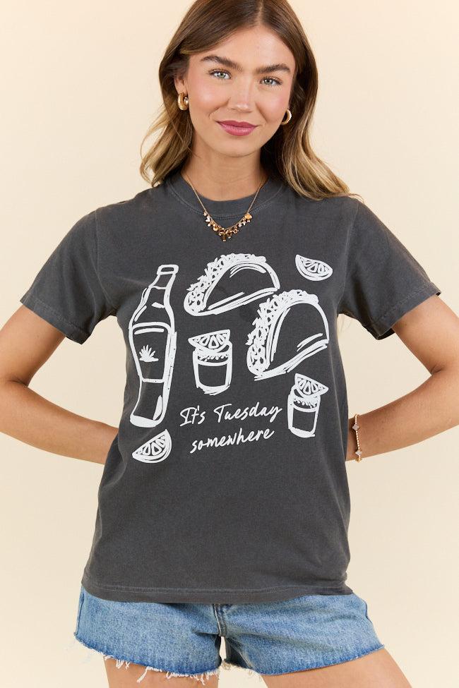 Details Dark gray t-shirt with taco Tuesday tequila lime design Crew neckline Short sleeves Material and Care Comfort Color Tee 100% cotton For best results, wash inside out on a gentle cycle with cold or lukewarm water. Tumble dry low or hang to dry to keep your tee looking fab! Size and Fit Size Small approximate measurements. Relaxed fit, size up 2 sizes for oversized fit Chest Width: 17.25” Body Length: 25.6"