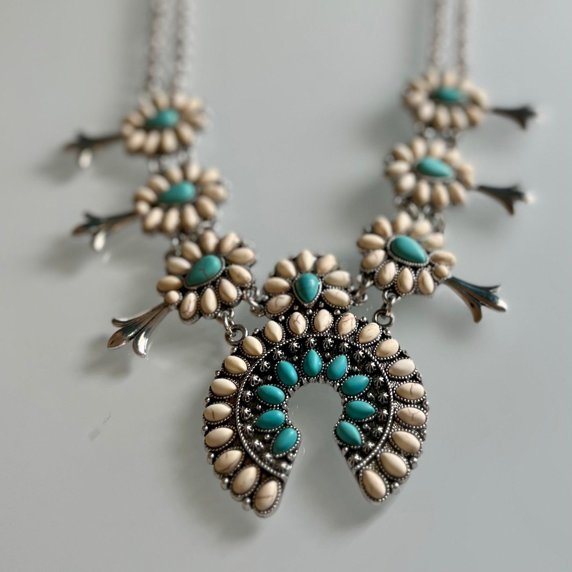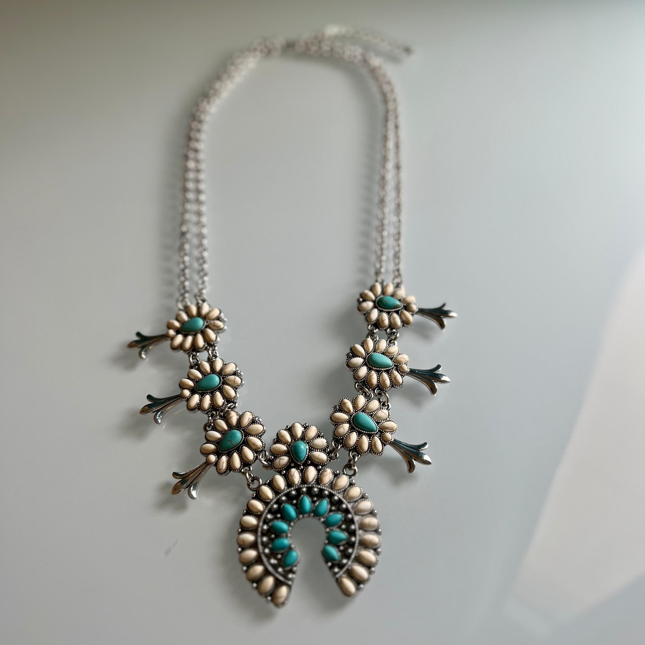 This statement piece is sure to make a statement at any event: the It Takes Two Squash Blossom Necklace. Features include a choice of turquoise or turquoise and white, a 22" silver chain with a 3" adjustable clasp, 7 mini stone conchos for added character, and a double chain with a 2" squash blossom. Feel fashionable and distinctive!