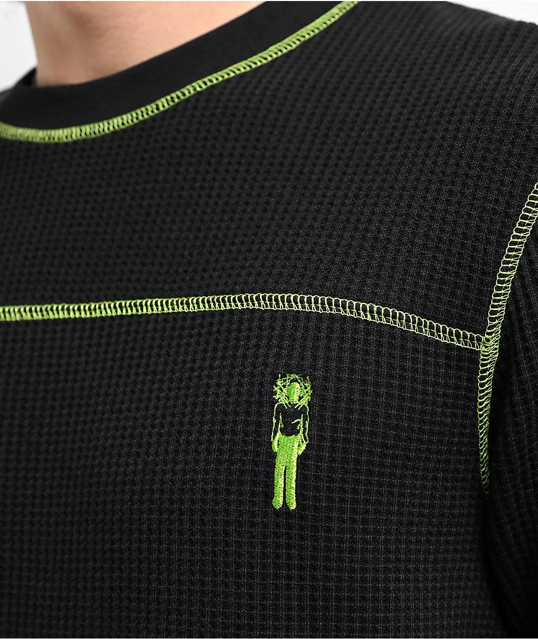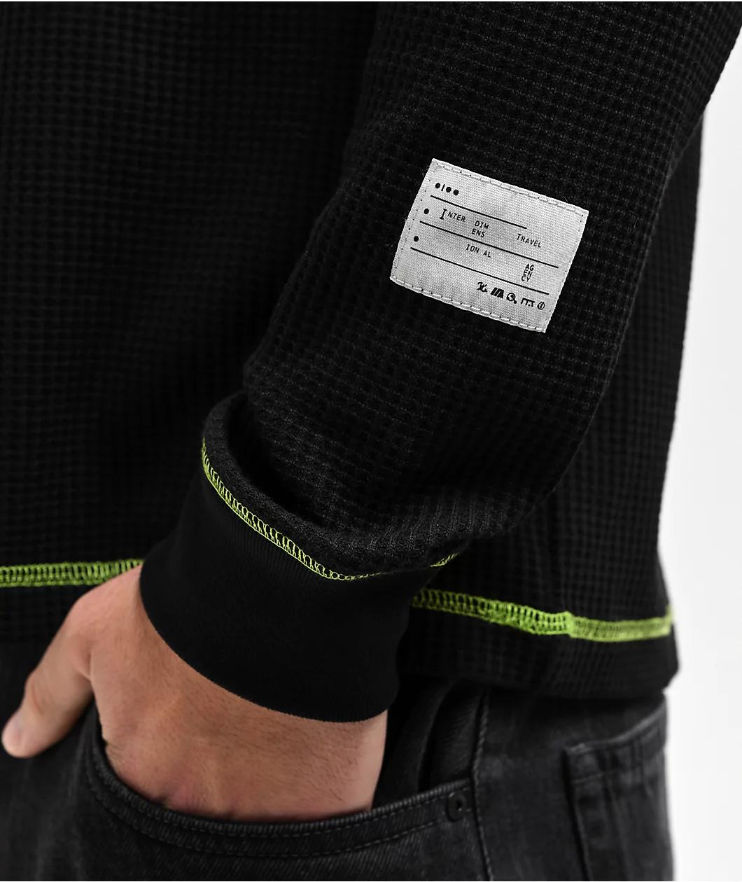 Arriving from Interdimensional Travel Agency in a solid black color scheme with yellow contrast stitching throughout, the Joule t-shirt lands with a long sleeve silhouette and a thermal construction for comfy layering. Showcasing luxury embroidery on