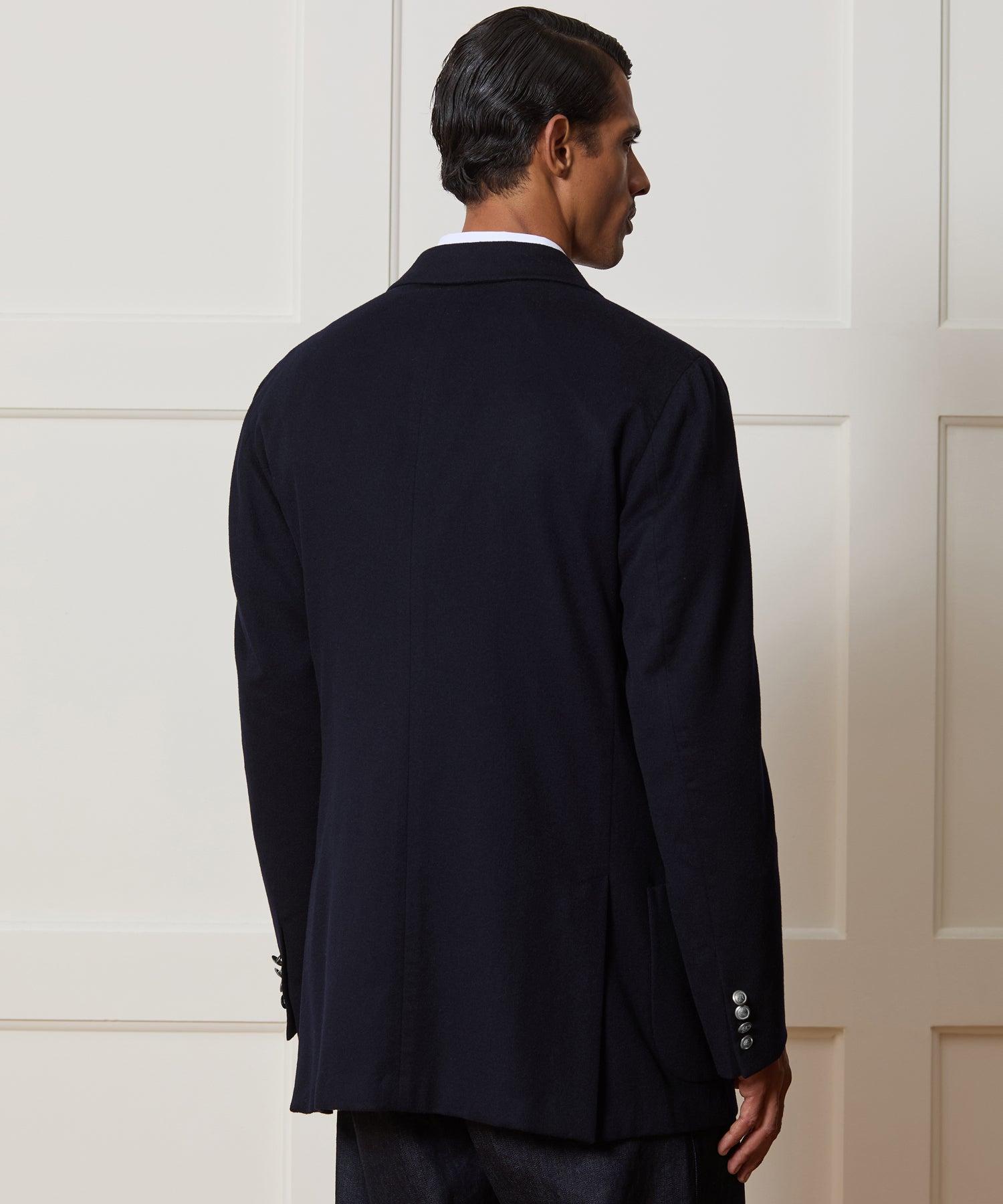 Our Wythe Suit Jacket is both elegant and casual, representing the epitome of soft tailoring. It has an oversized, vintage-inspired fit and natural shoulders; slouchy and chic, but not shapeless. There’s also a double vent in the back and no lining, to help with keeping you cool. This take is crafted from an incredibly luxurious cashmere, made in Italy at Loro Piana, which is warm and plush but also surprisingly light — the dark navy shade is set off by silver metal buttons. Relaxed Fit Unlined Natural Shoulder Peak Lapel Double-Breasted Metal Buttons Welt Chest Pocket Two Flap Hip Pockets Interior Pocket Double Vent Fabric from Italy Garment Made in Italy Style BC154551