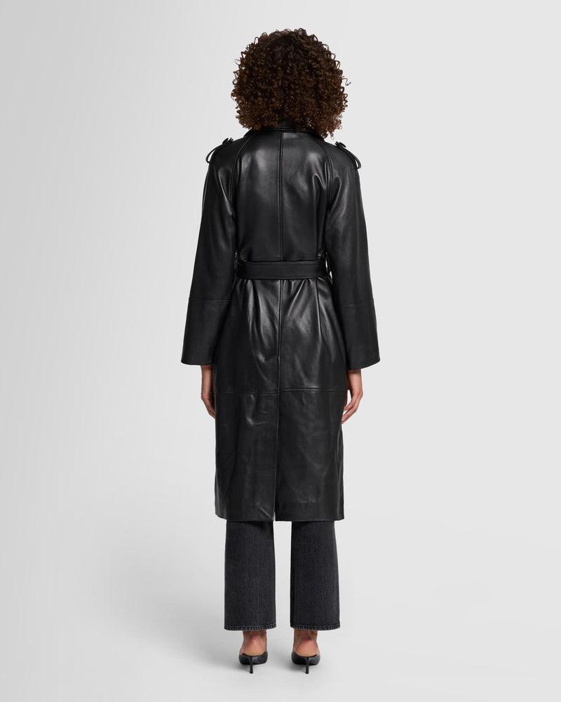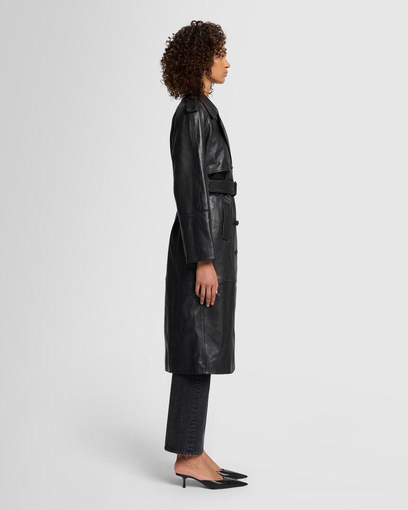 Fits like: Relaxed, knee-length coat with removable self-tie belt. Feels like: Thick, buttery-soft leather. The Details: 100% Italian leather Peaked lapel Long sleeve Double-breasted front Button closure Side welt pockets Epaulette shoulder detail Removable belt with roller buckle fastening Storm flap with button closu