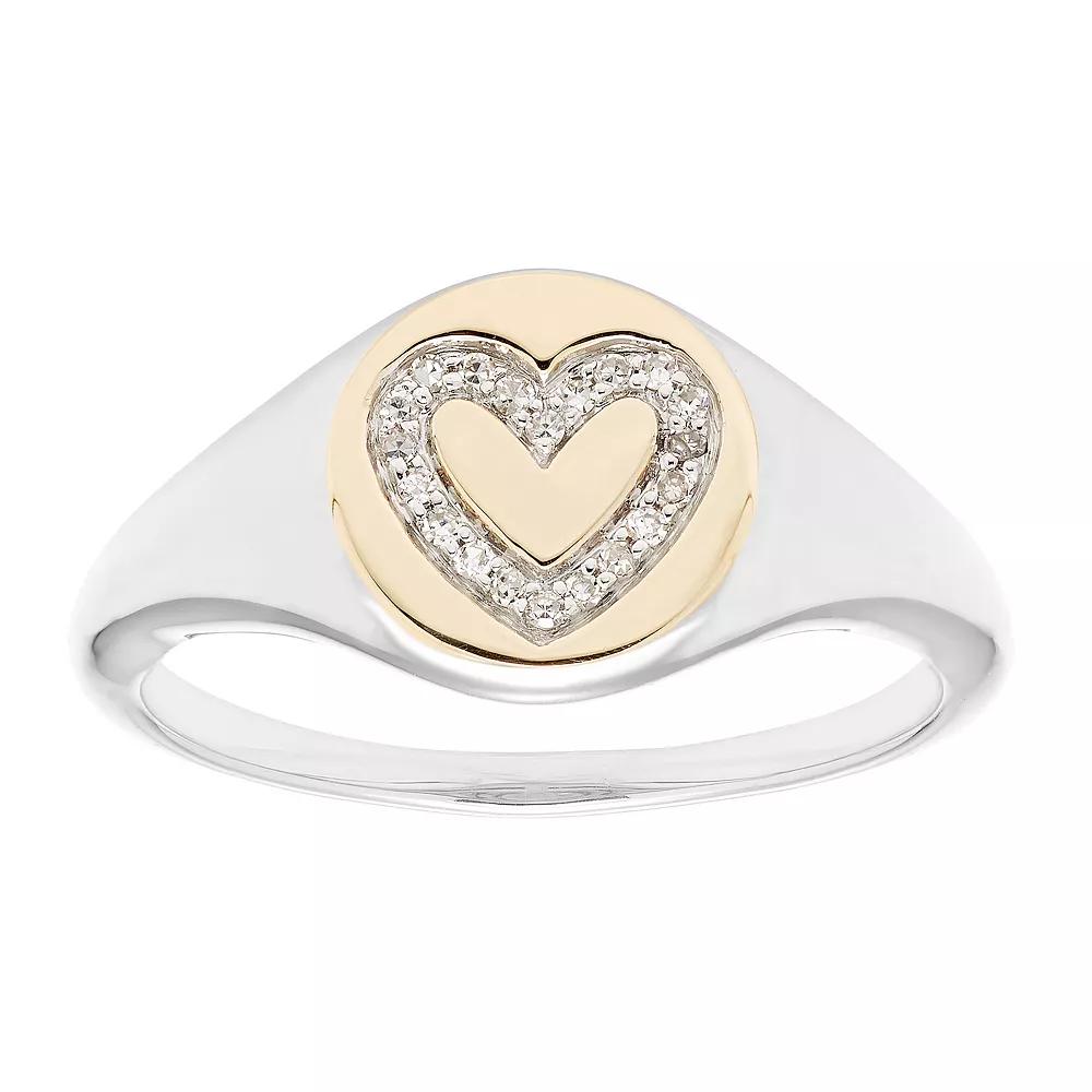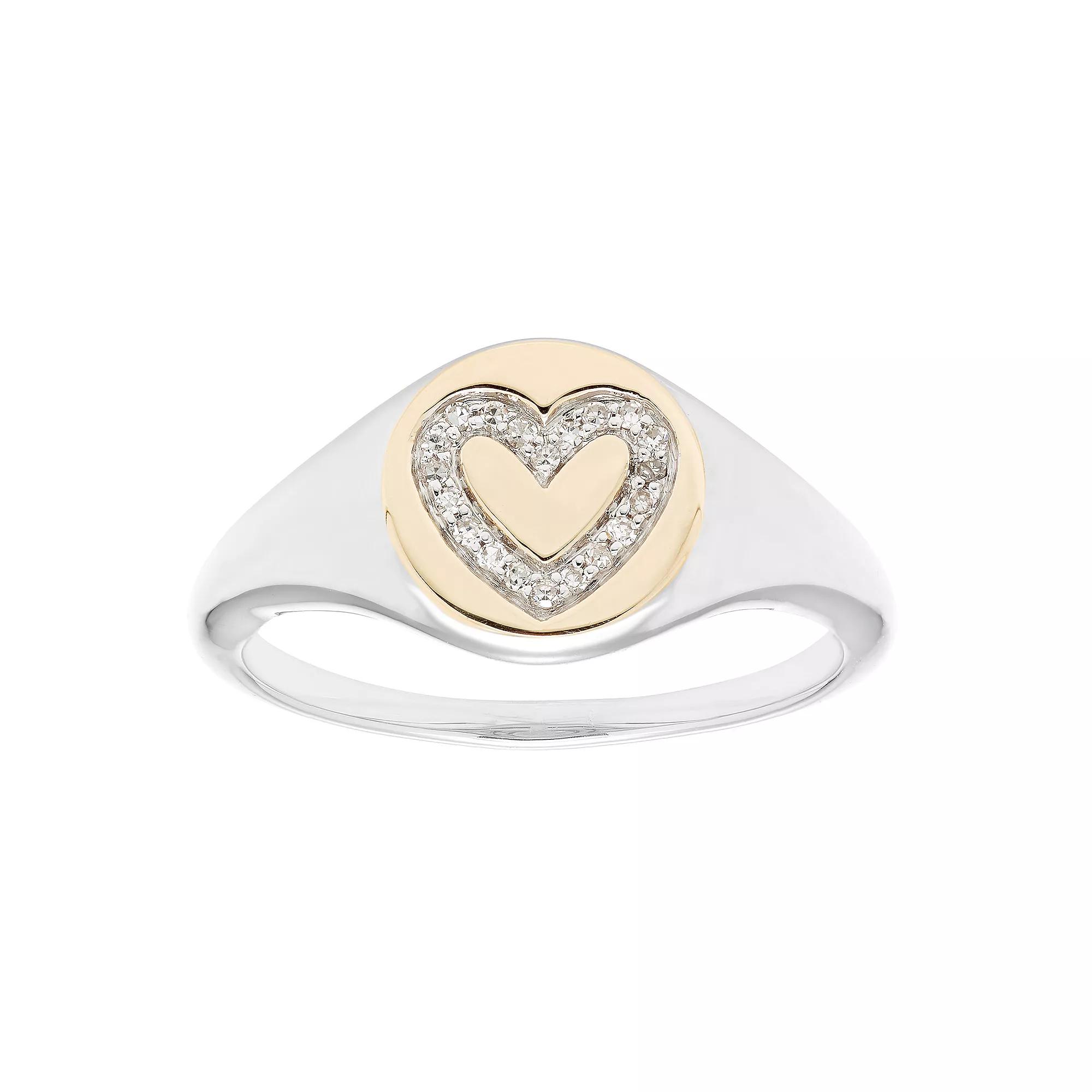 You'll absolutely love this gorgeous 14k gold over sterling silver diamond accent heart signet ring. You'll absolutely love this gorgeous 14k gold over sterling silver diamond accent heart signet ring. Width: 12.5 mm Metal: sterling silver Plating: 14k gold Finish: polished Packaging: boxedDIAMOND DETAILS Total weight: less than 1/10 ct. Shape: round brilliant Setting: micro pave Diamond weights are approximate. Diamond total weights may vary between .01 and .08 ct. Some diamonds have fewer than 17 facets. Gemstones may have been treated to enhance their appearance. Special care may be required. Please visit our Gemstone Treatment & Special Care Guide for more information. Image(s) may be enlarged to show detail. Please note, due to the high value of this item, a signature may be required upon delivery. Color: White. Gender: female. Age Group: adult.
