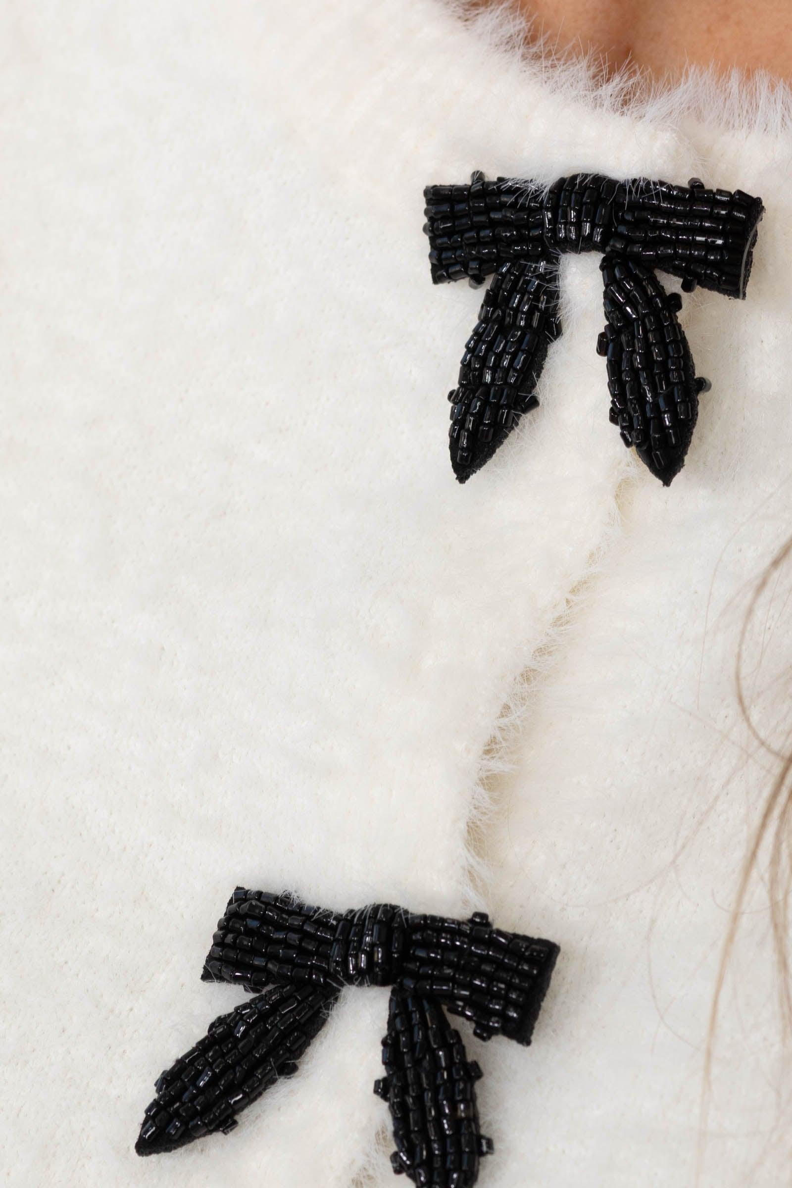 Product Details Colors: Ivory, Black Print: Textured Solid With Beaded Snap Bows Neckline: Button Down Sleeve: Long Sleeve Hemline: Straight Brand: Staccato Material and Care 100% Nylon Hand Wash Cold Hang/ Line Dry Size and Fit Small: Bust 38" Waist 38" Length 22" Medium: Bust 40" Waist 40" Length 22.5" Large: Bust 42" Waist 42" Length 23" X Large: Bust 44" Waist 44" Length 23.5" Erica is 5’7” and wearing her true size small